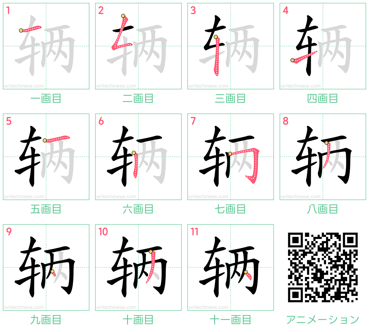 中国語の簡体字「辆」の筆順アニメーションを見て、「辆」という漢字の書き方を学びましょう。