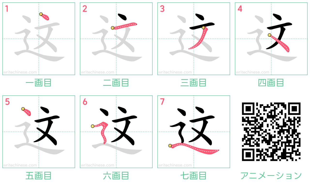 視覚的なステップバイステップの指示を使って、中国語の漢字「这」の書き順を一画ずつマスターしましょう。