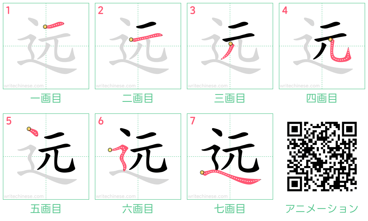 視覚的なステップバイステップの指示を使って、中国語の漢字「远」の書き順を一画ずつマスターしましょう。