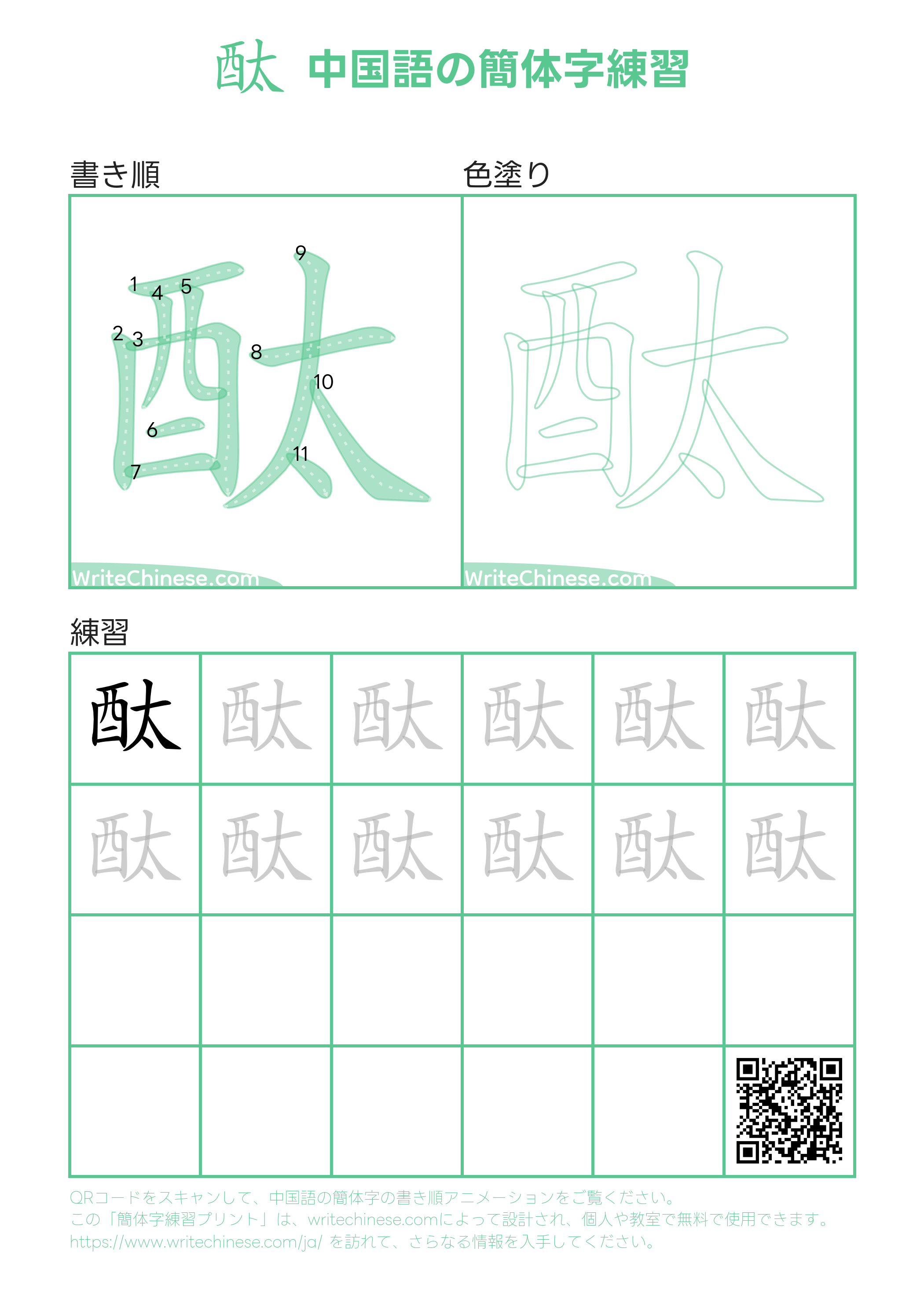 視覚的なステップバイステップの指示を使って、中国語の漢字「酞」の書き順を一画ずつマスターしましょう。