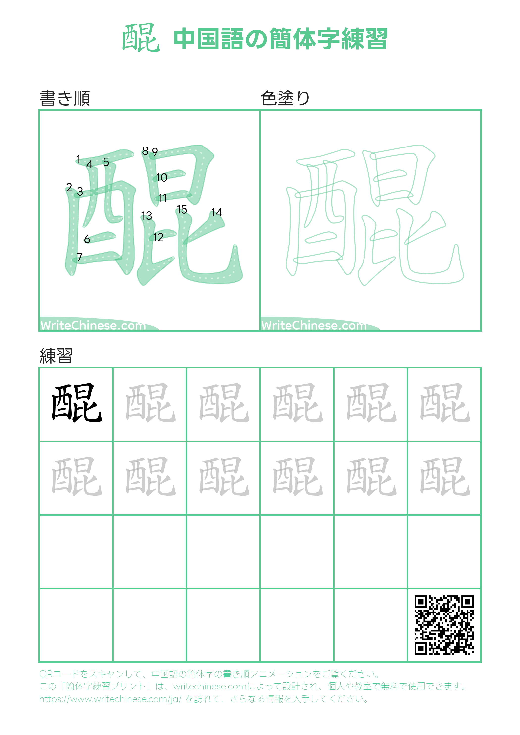 書道の先生によるビデオチュートリアルで、中国語「醌」の正しい書き方を学びましょう。書道の達人によるステップバイステップのガイドに従って、中国語「醌」を書きましょう。以下の印刷可能な手書き用のワークシートをダウンロードして、ペンと紙で一緒に書く練習をしましょう。