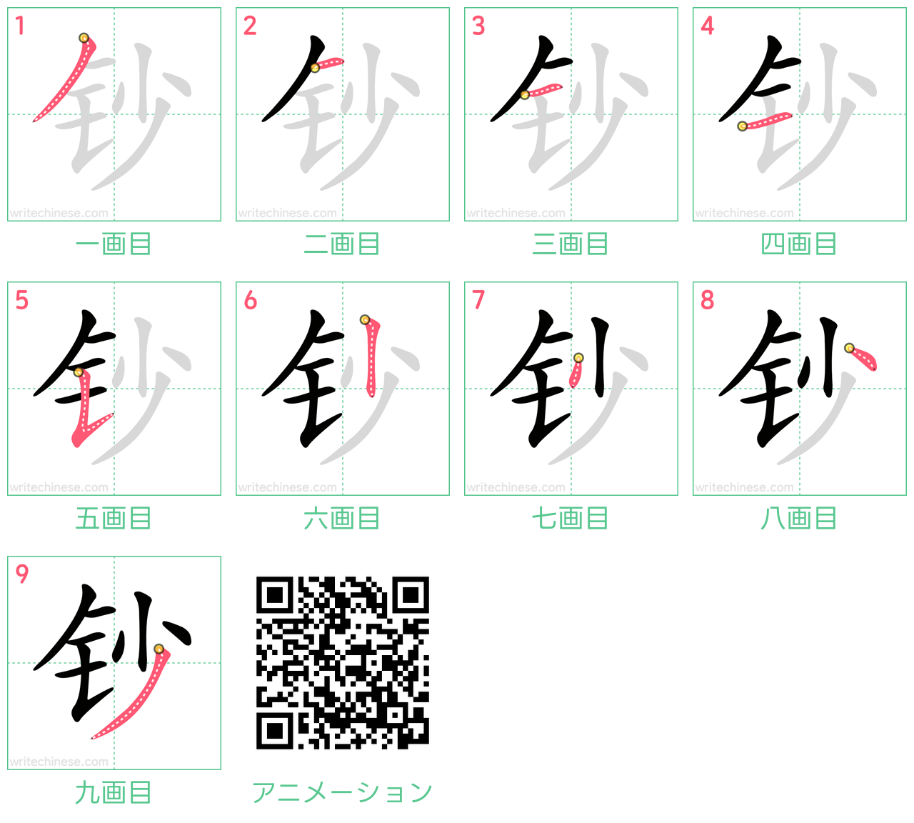 視覚的なステップバイステップの指示を使って、中国語の漢字「钞」の書き順を一画ずつマスターしましょう。