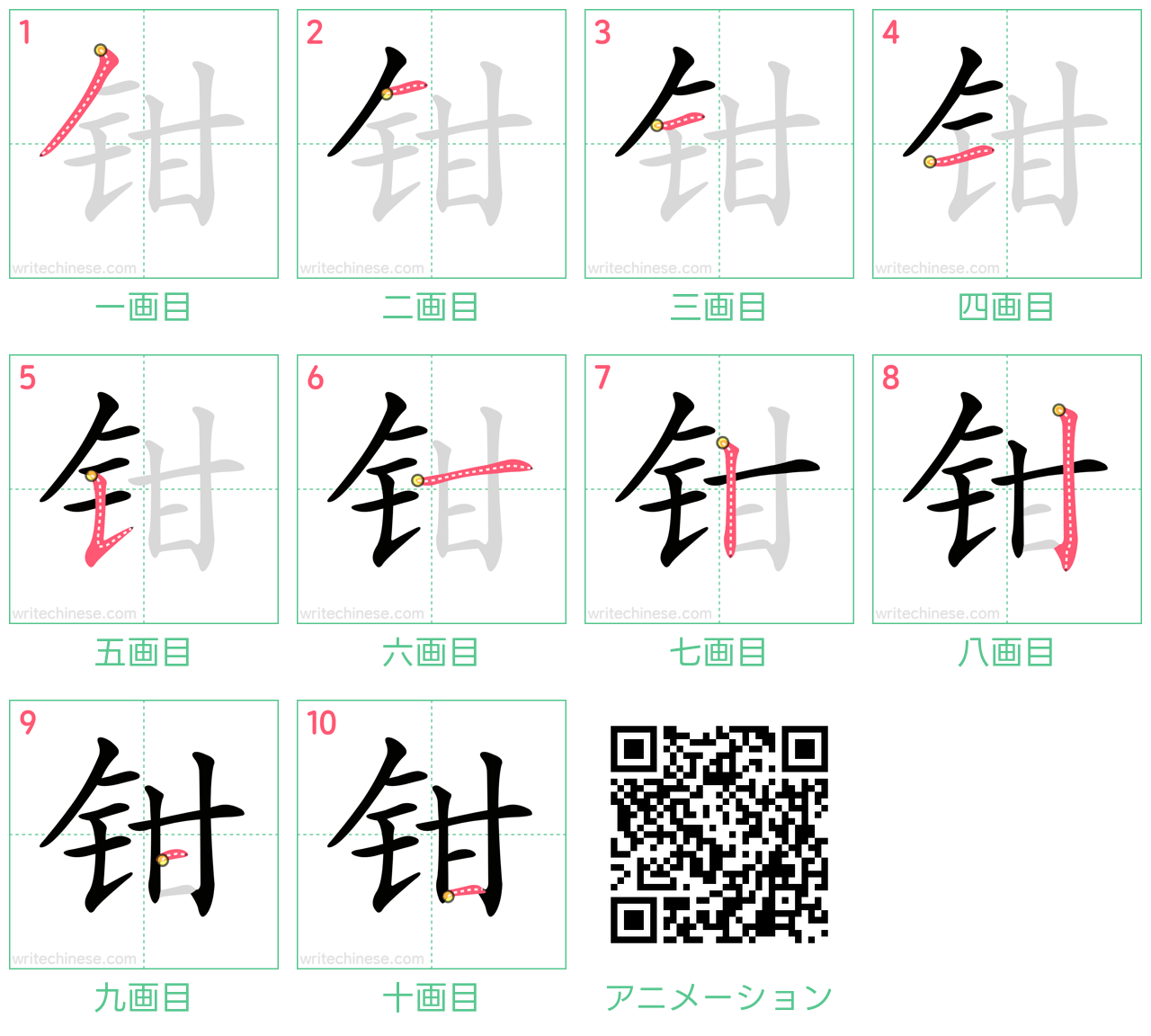 中国語の簡体字「钳」の書き順練習用の印刷可能なワークシート 漢字練習帳