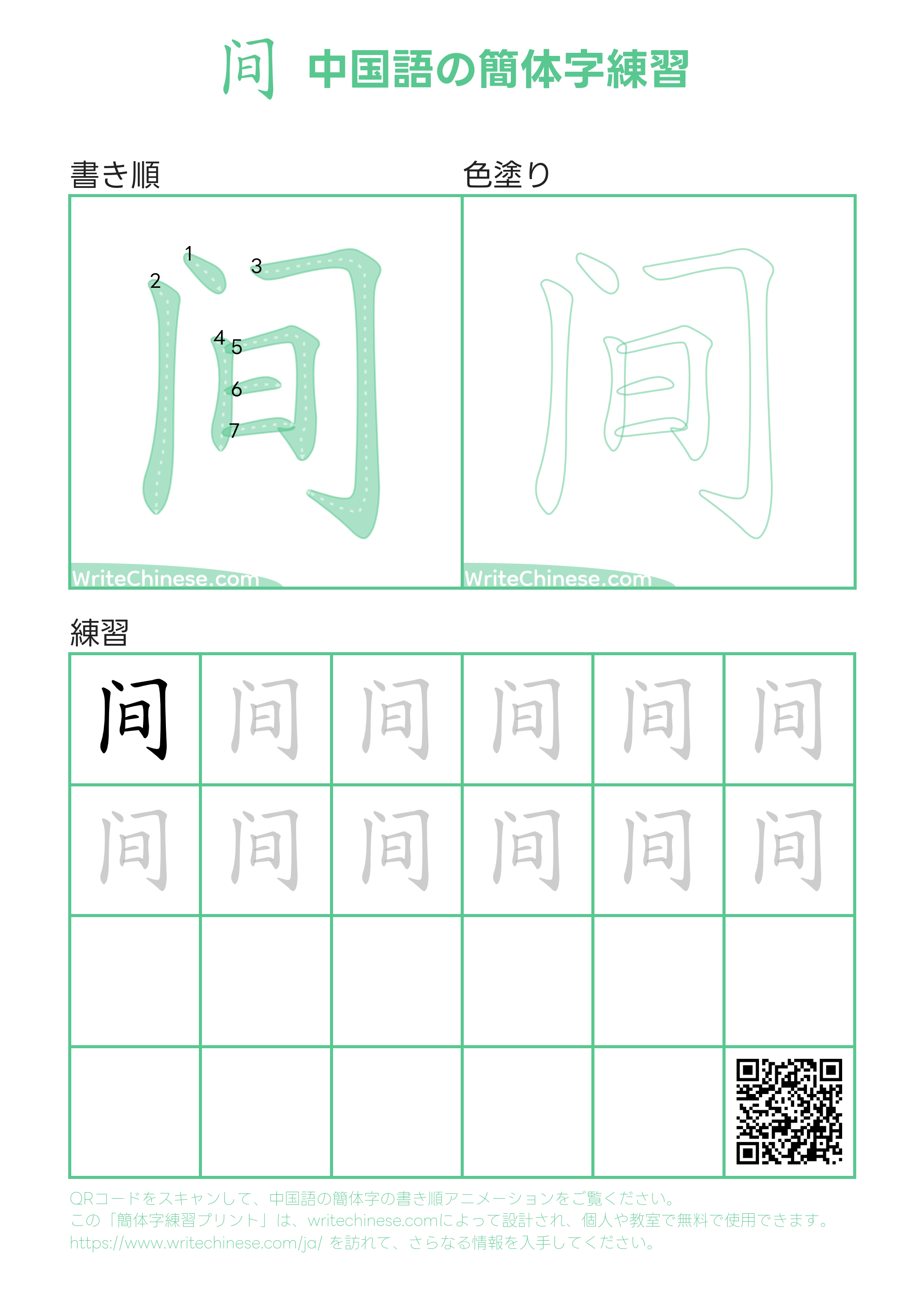 中国語の簡体字「间」の書き順練習用の印刷可能なワークシート