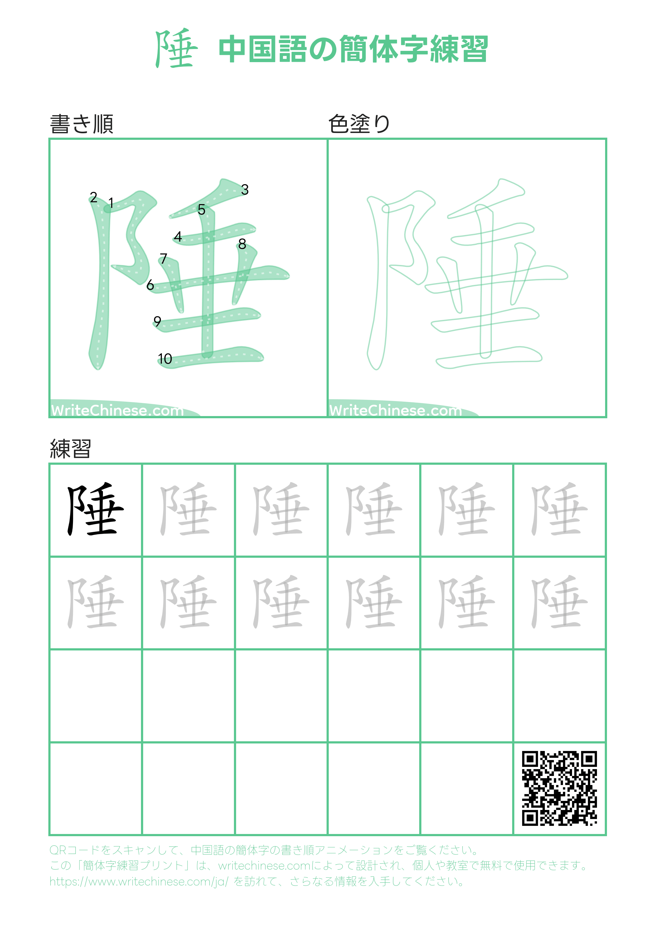 視覚的なステップバイステップの指示を使って、中国語の漢字「陲」の書き順を一画ずつマスターしましょう。