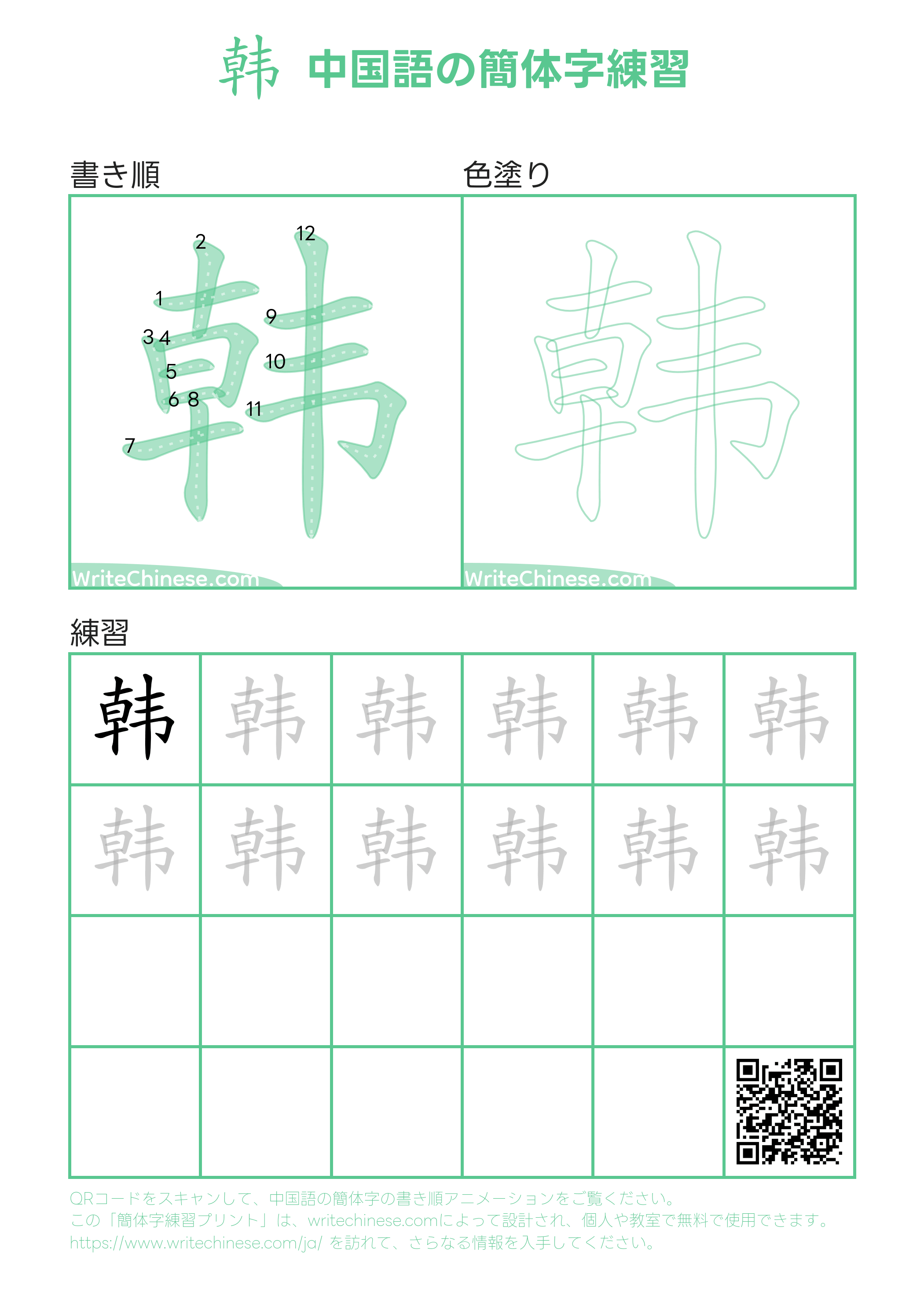 中国語の簡体字「韩」の書き順練習用の印刷可能なワークシート