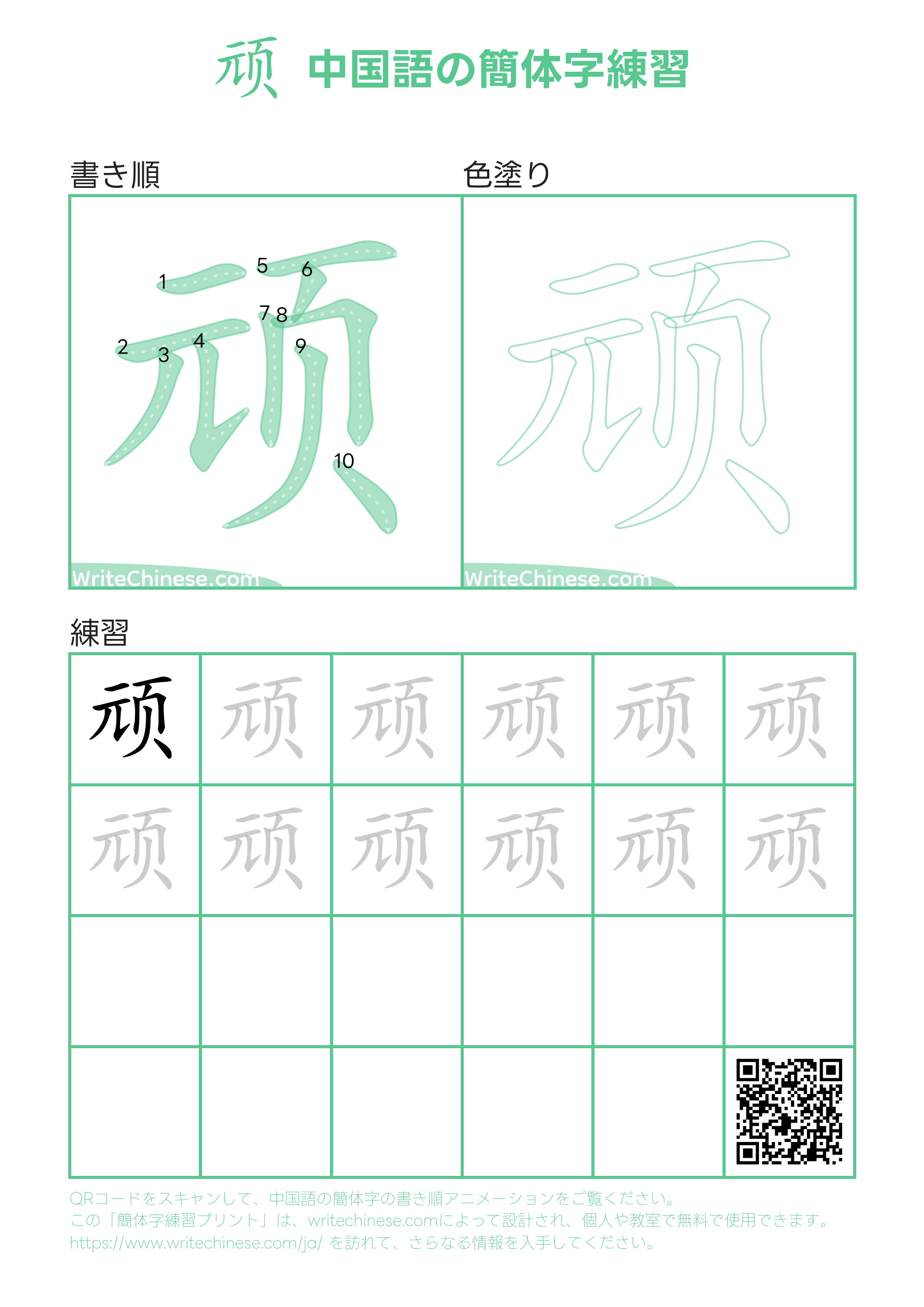 無料の印刷可能な「顽」の手書き練習用ワークシート