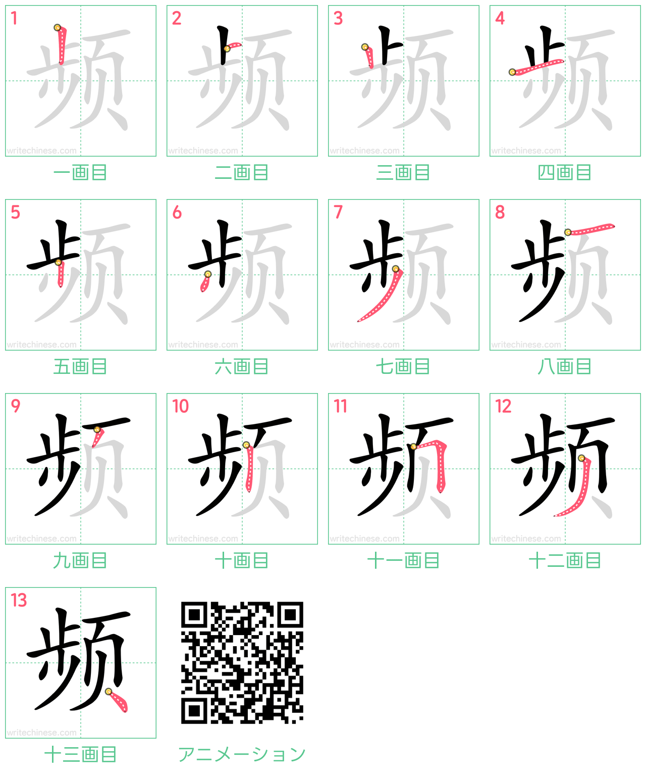 視覚的なステップバイステップの指示を使って、中国語の漢字「频」の書き順を一画ずつマスターしましょう。
