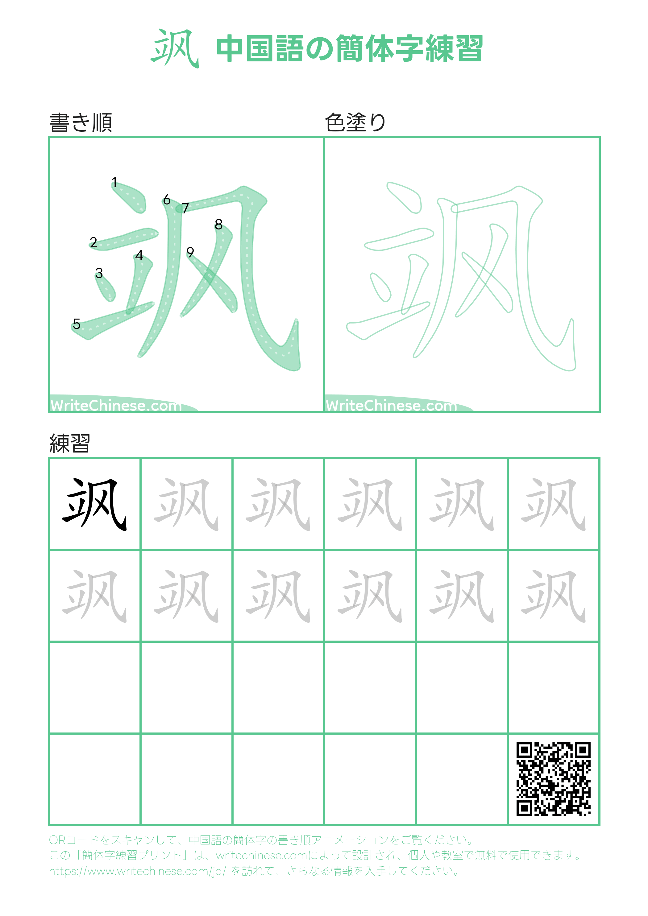 中国語の簡体字「飒」の印刷可能な書き練習用ワークシート