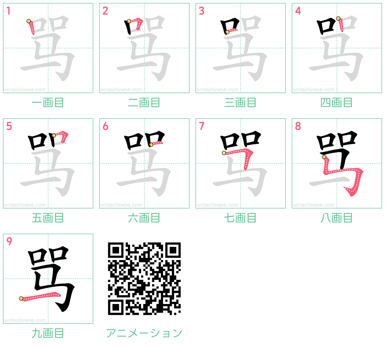 視覚的なステップバイステップの指示を使って、中国語の漢字「骂」の書き順を一画ずつマスターしましょう。
