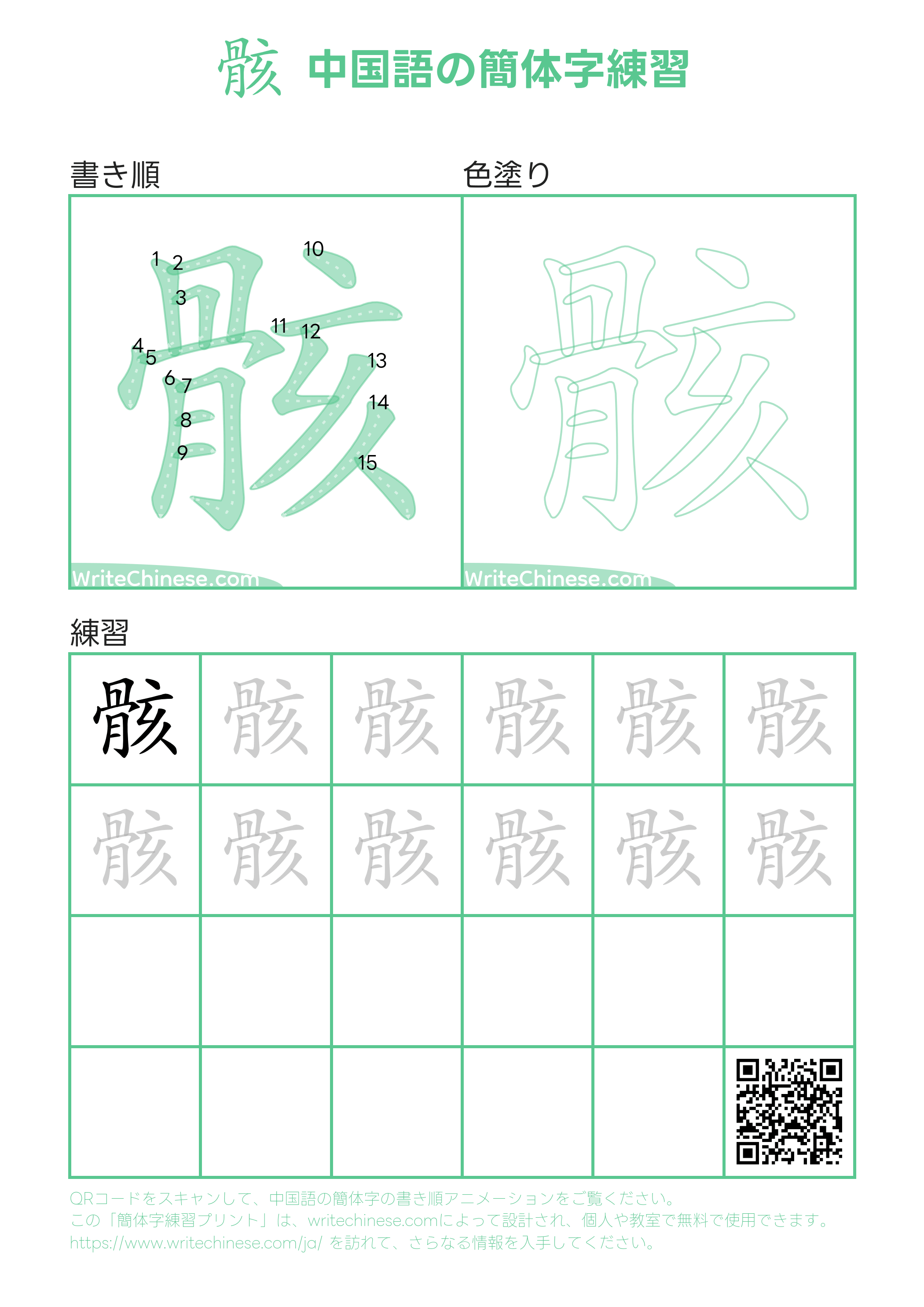 中国語の簡体字「骸」の書き順練習用の印刷可能なワークシート