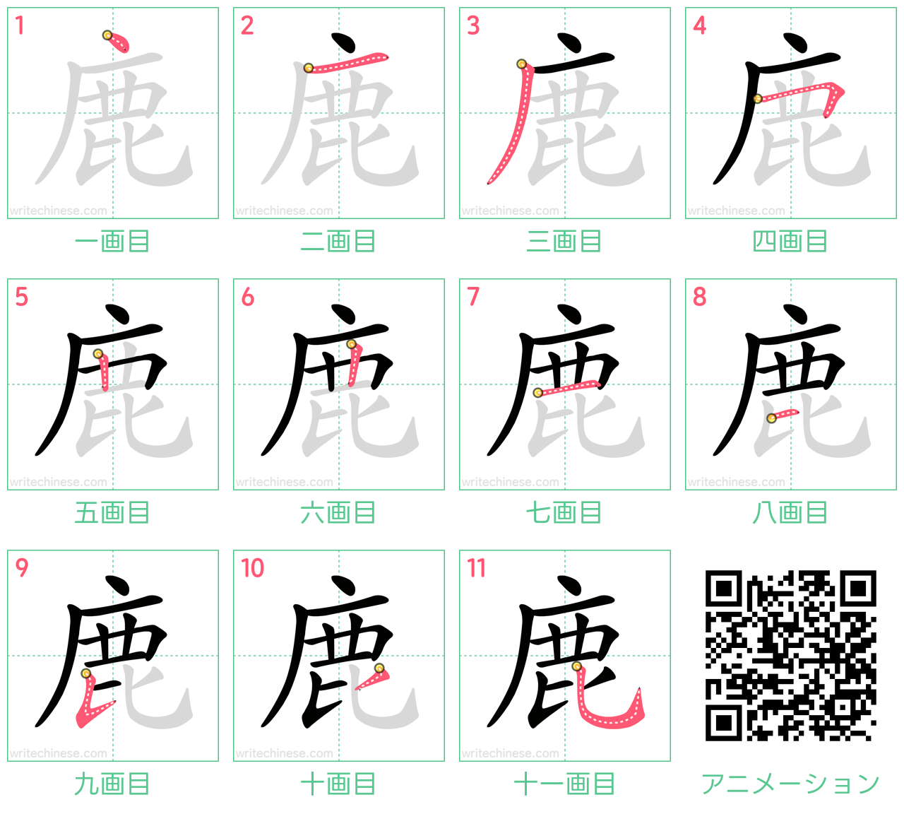 視覚的なステップバイステップの指示を使って、中国語の漢字「鹿」の書き順を一画ずつマスターしましょう。
