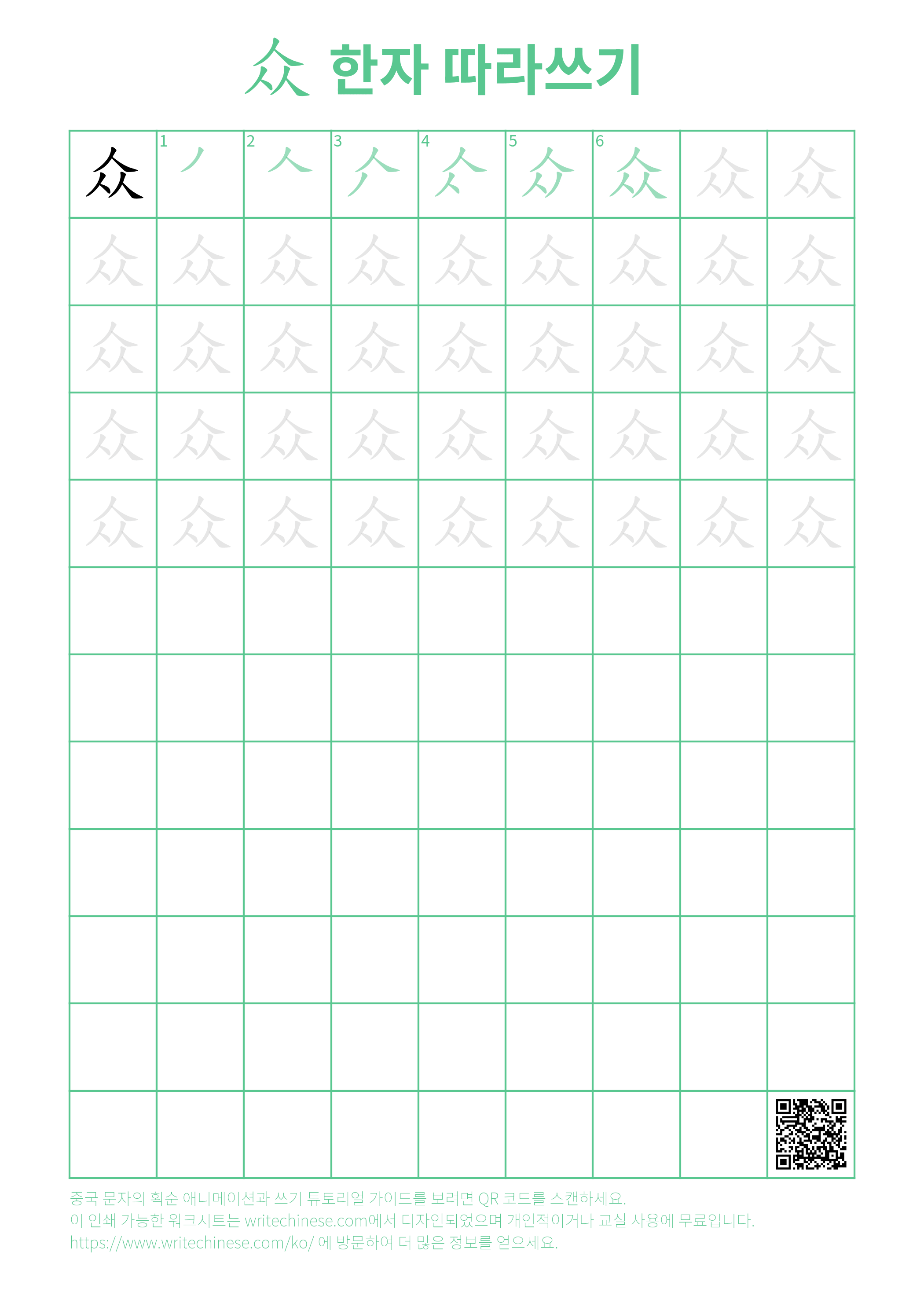 글씨 대가를 따라가며 '众' 문자를 단계별로 쓰는 방법을 익혀 보세요. 캘리그라피 선생님과 함께하는 비디오 튜토리얼을 통해 중국 문자 '众'의 올바른 쓰기 방법을 배울 수 있습니다. 아래 링크에서 인쇄용 필기 연습지를 다운로드하여 종이와 펜과 함께 연습해 보세요.