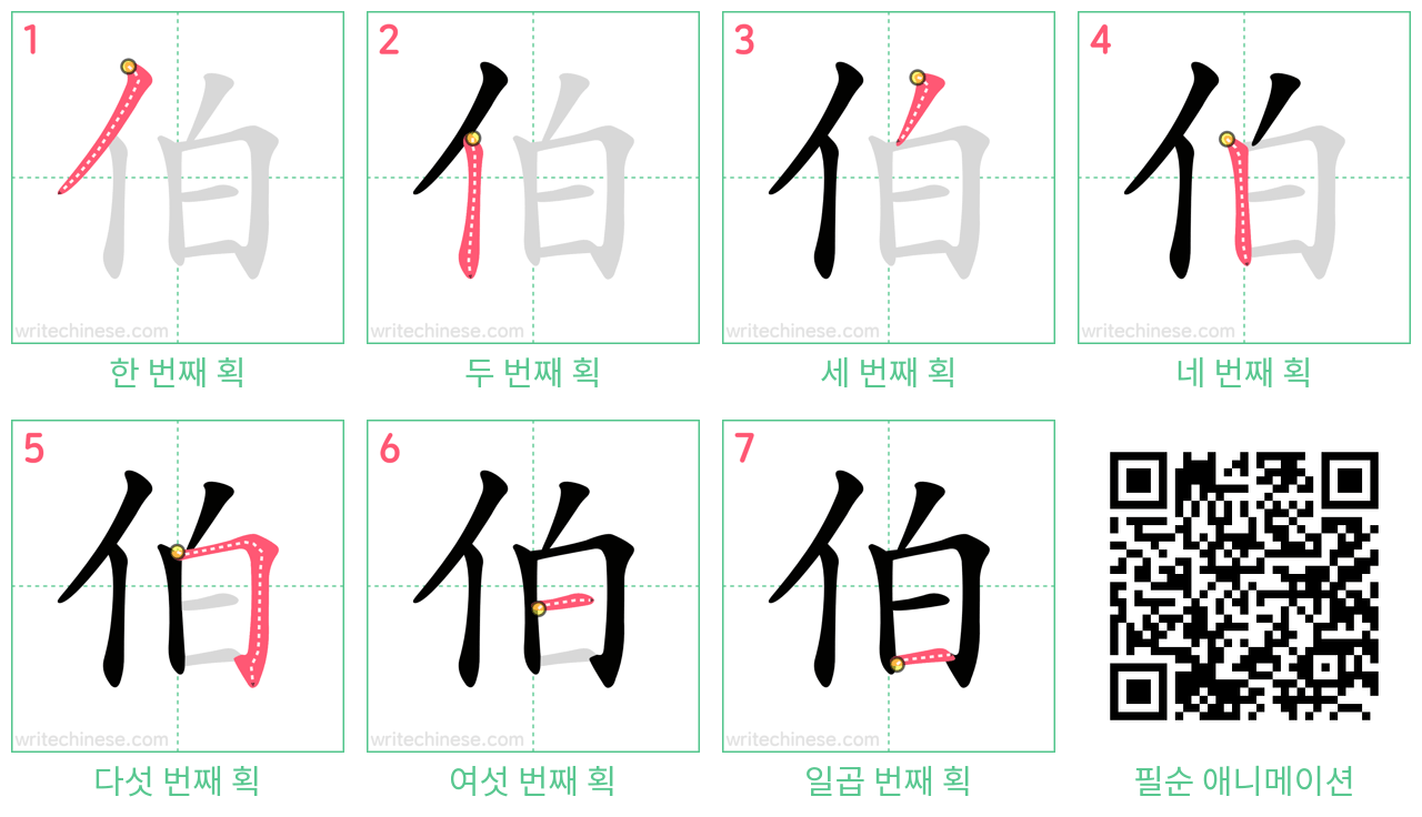 "伯"의 획순 애니메이션을 보면서 중국 문자 "伯"을 쓰는 법을 배워 보세요.