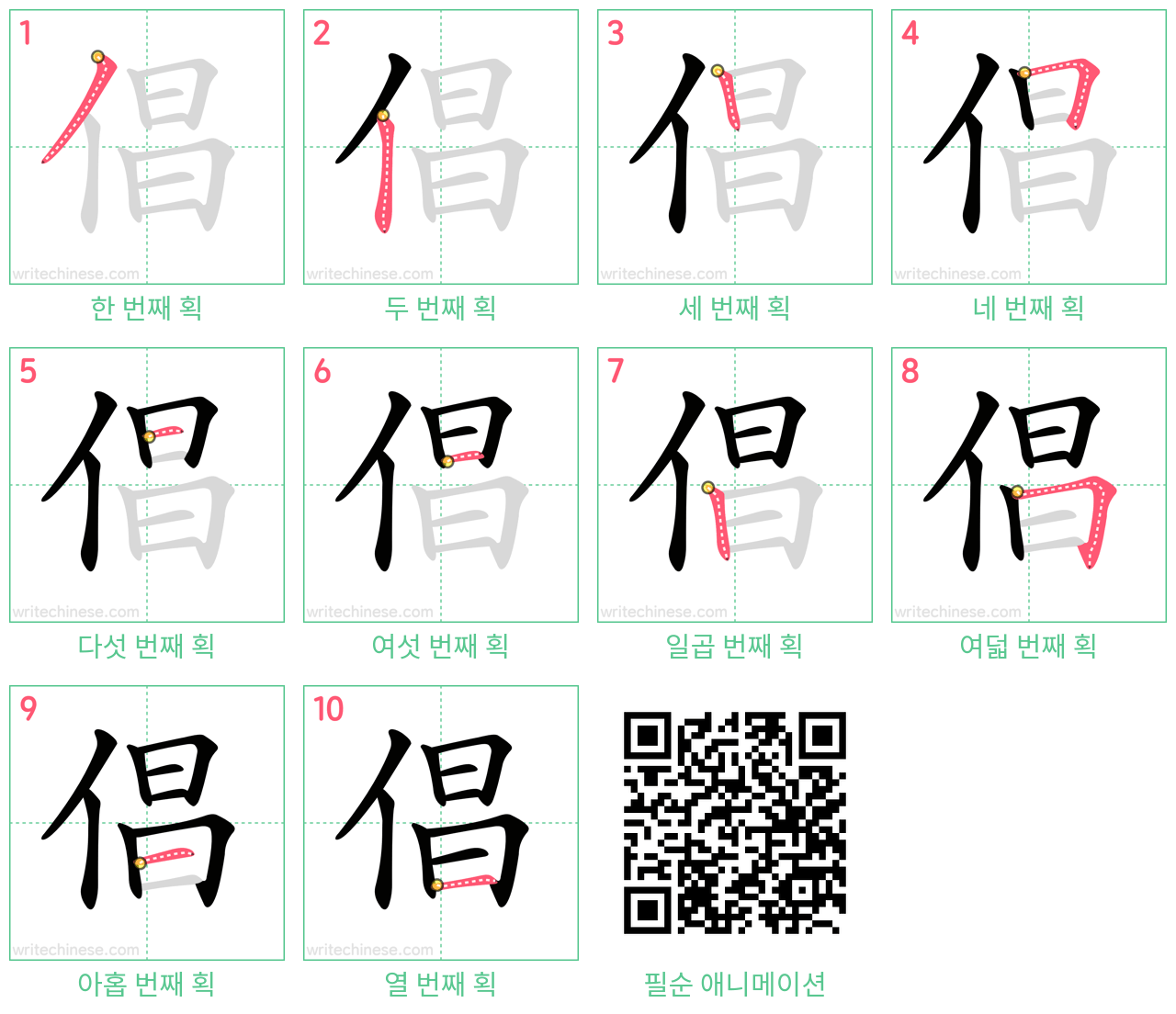 "倡"의 획순 애니메이션을 보면서 중국 문자 "倡"을 쓰는 법을 배워 보세요.
