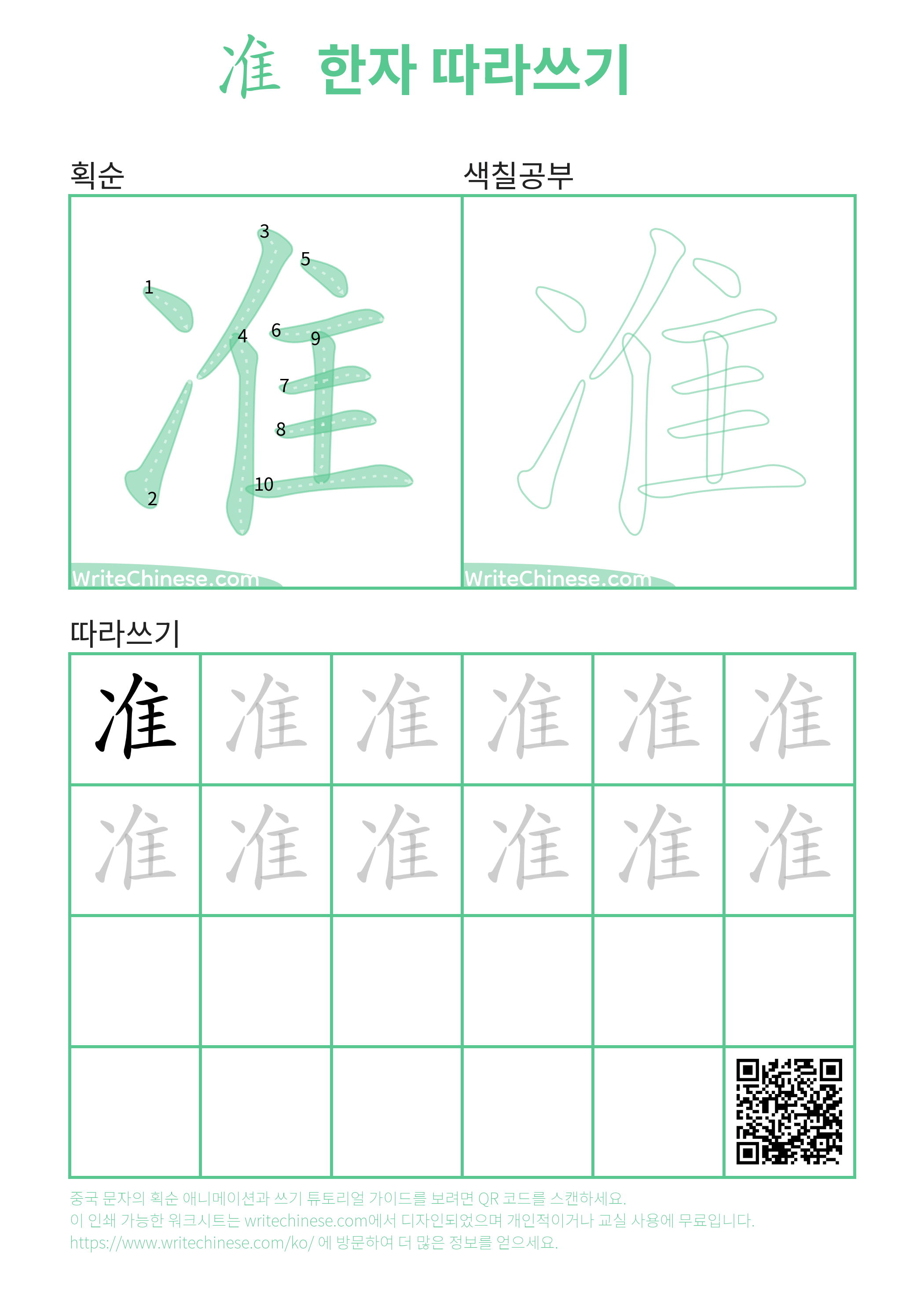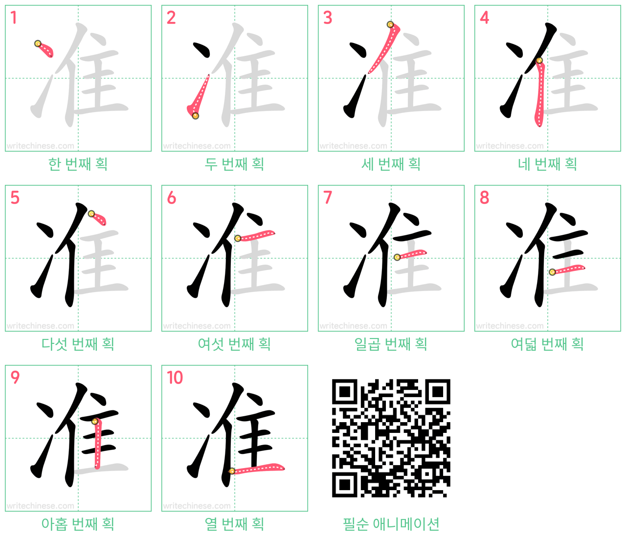 한 획 한 획: 准의 쓰기 순서. 시각적인 단계별 안내를 통해 중국 문자 '准'의 획을 하나씩 익혀 보세요.