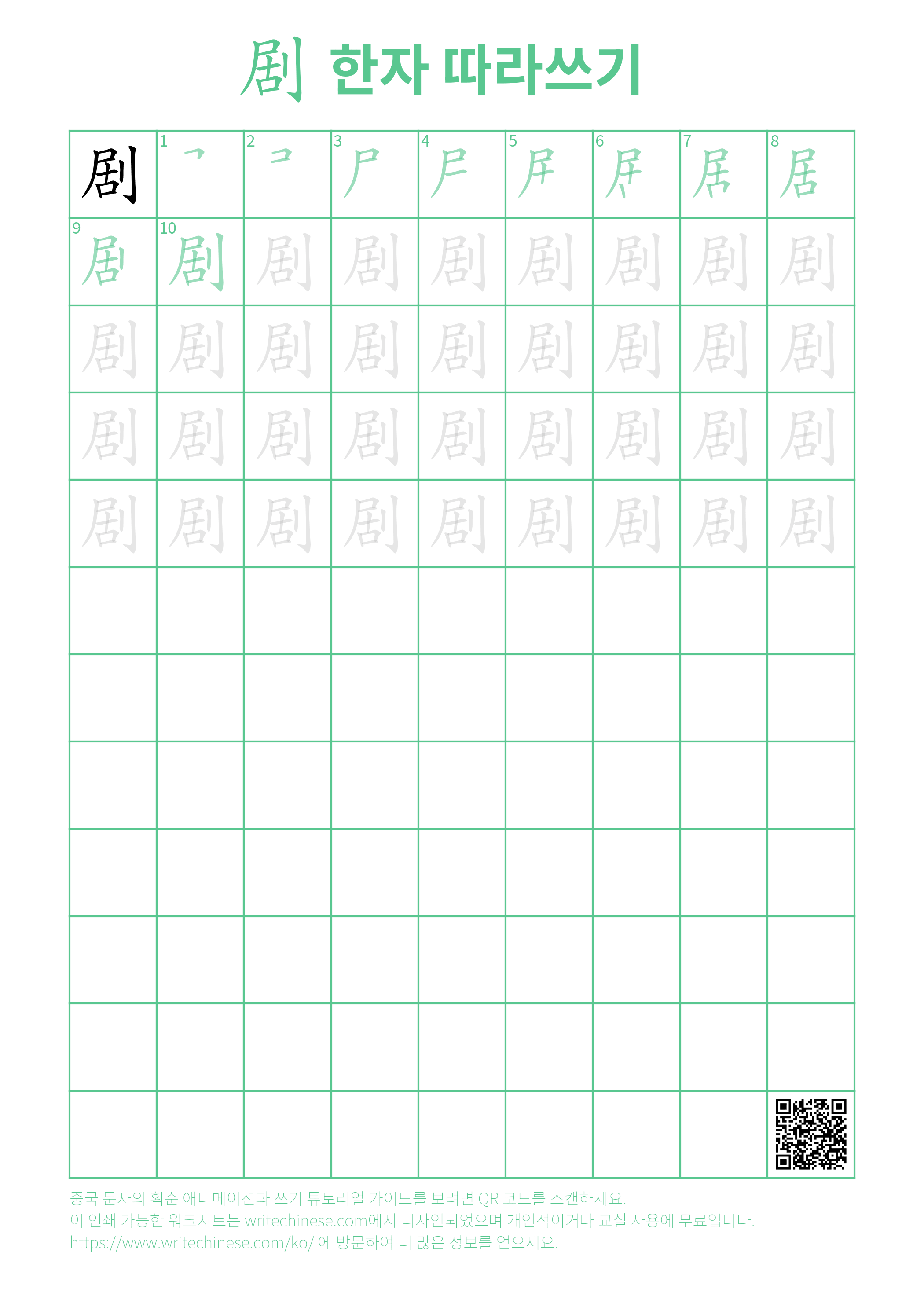 "剧"의 획순 애니메이션을 보면서 중국 문자 "剧"을 쓰는 법을 배워 보세요.