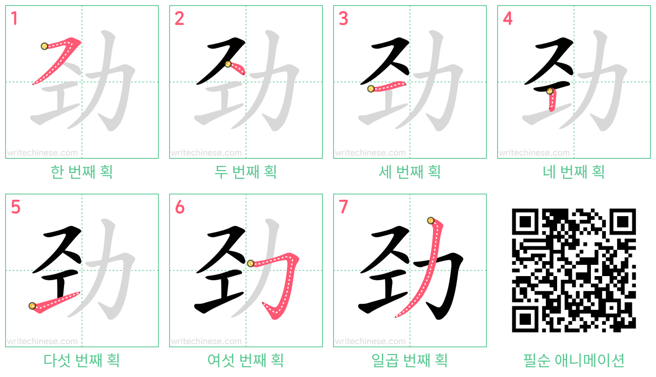 * 예: 강력한 군대 (劲兵); 큰 힘 (牛劲儿); 힘을 더하다 (加劲); 힘을 쓰다 (用劲); 힘차다 (带劲); 다리의 힘 (脚劲).