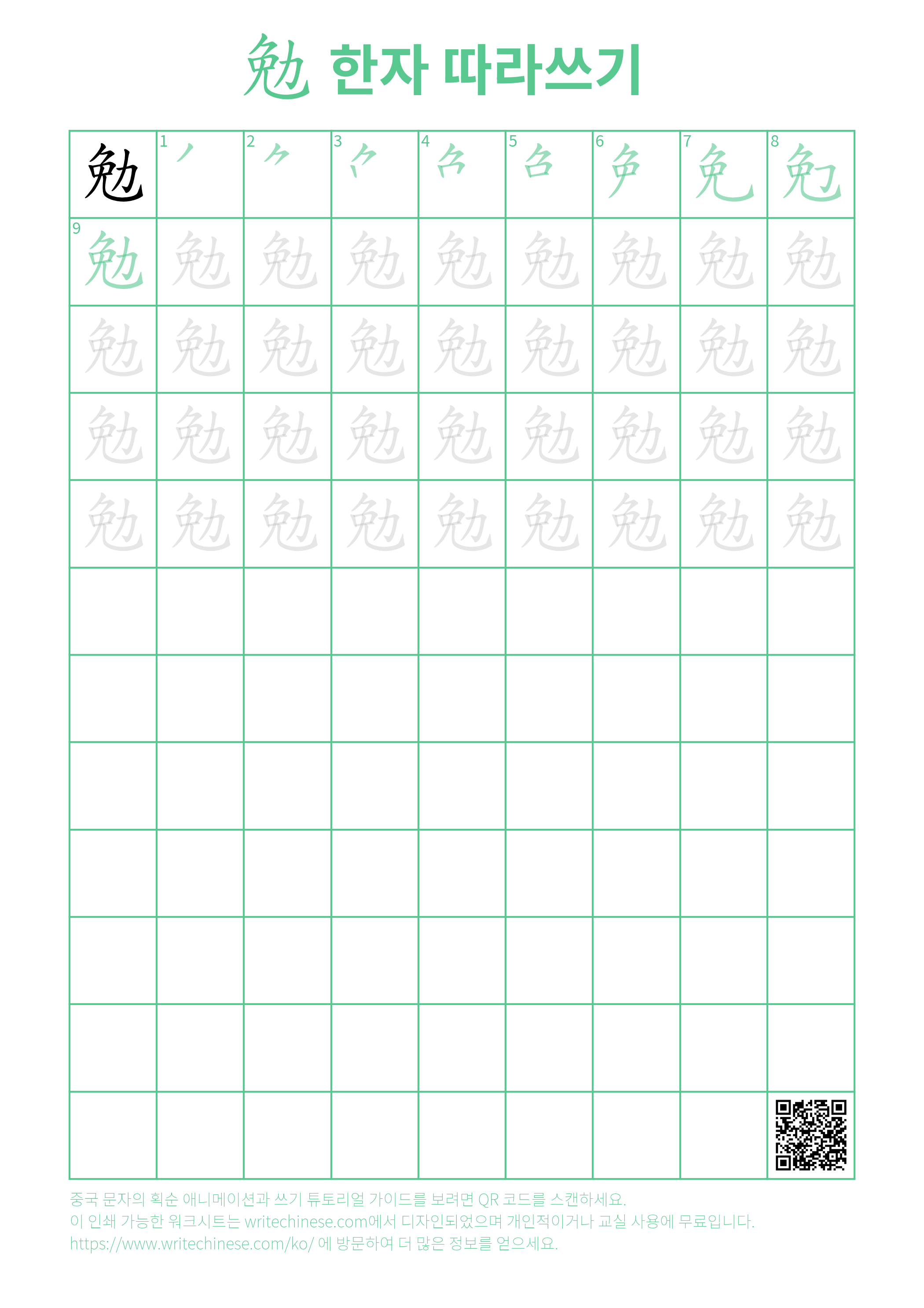 글씨 대가를 따라가며 '勉' 문자를 단계별로 쓰는 방법을 익혀 보세요. 캘리그라피 선생님과 함께하는 비디오 튜토리얼을 통해 중국 문자 '勉'의 올바른 쓰기