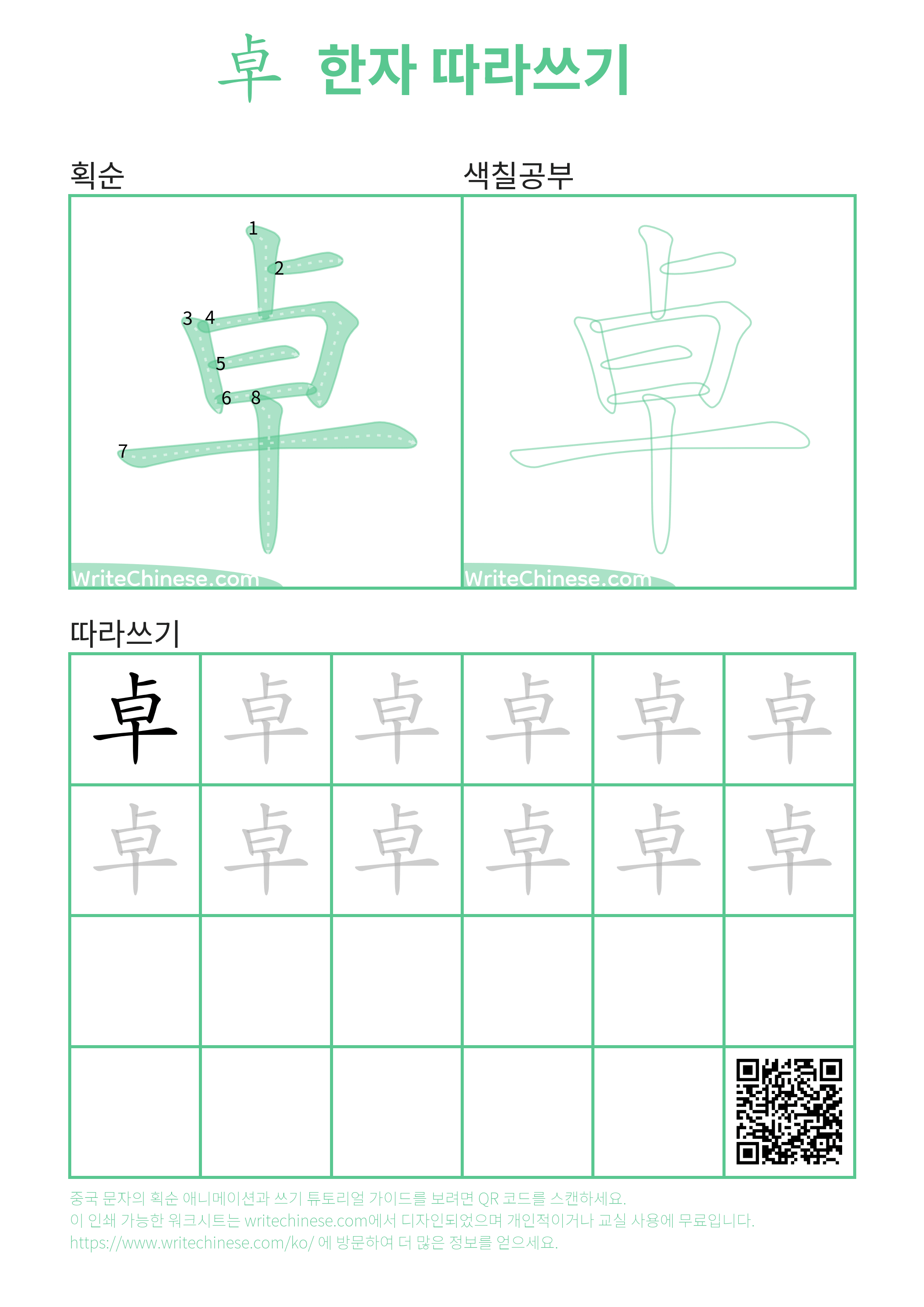 한 획 한 획: 卓의 쓰기 순서. 시각적인 단계별 안내를 통해 중국 문자 '卓'의 획을 하나씩 익혀 보세요.