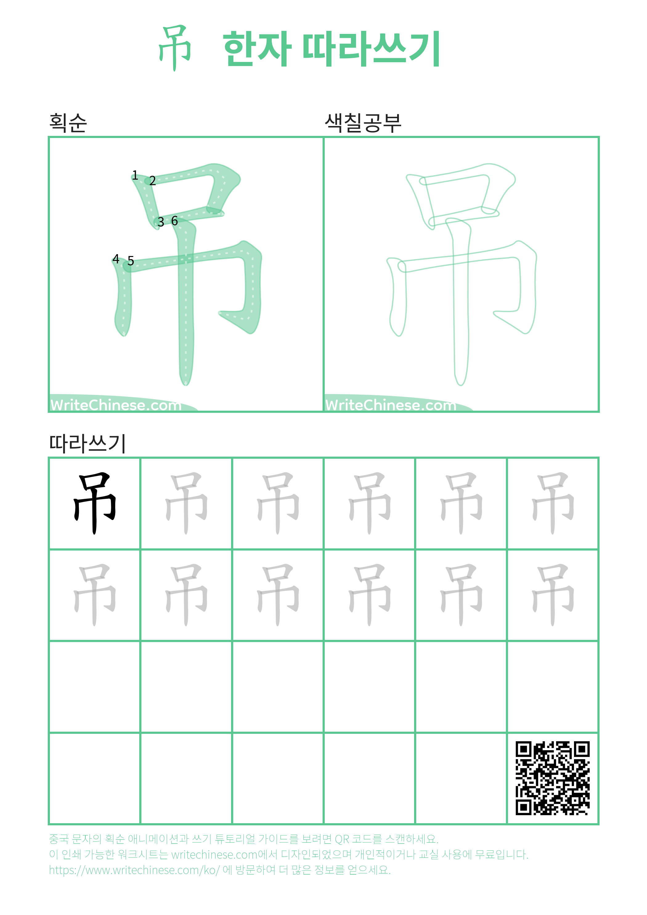 글씨 대가를 따라가며 '吊' 문자를 단계별로 쓰는 방법을 익혀 보세요. 캘리그라피 선생님과 함께하는 비디오 튜토리얼을 통해 중국 문자 '吊'의 올바른 쓰기 방법을 배울 수 있습니다. 아래 링크에서 인쇄용 필기 연습지를 다운로드하여 종이와 펜과 함께 연습해 보세요.