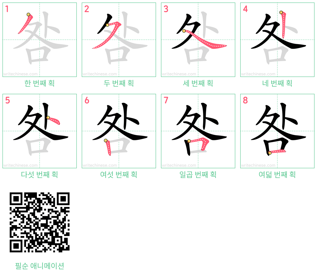 이 웹사이트의 중국어 획순 이미지, 애니메이션, 비디오 및 인쇄 가능한 연습지는 개인 또는 교실에서 무료로 사용할 수 있습니다. 사용할 때 출처와 웹사이트의 URL을 표기해 주세요.