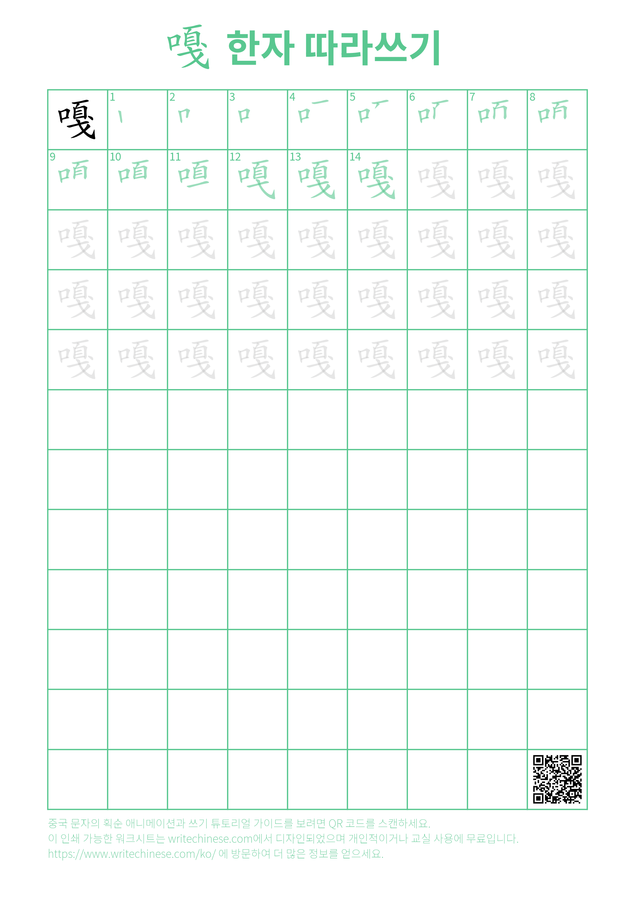 한 획 한 획: 嘎의 쓰기 순서. 시각적인 단계별 안내를 통해 중국 문자 '嘎'의 획을 하나씩 익혀 보세요.