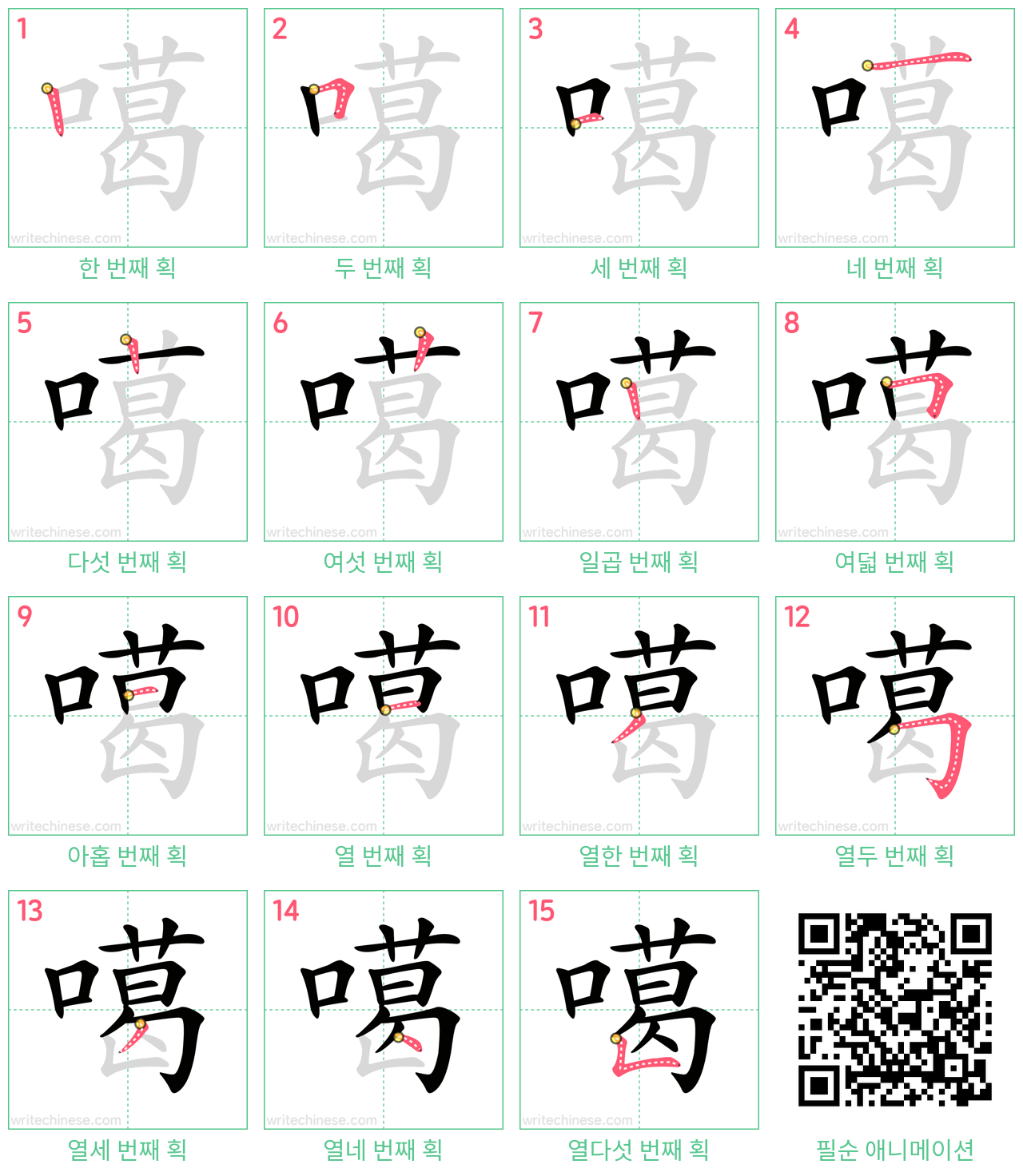 한 획 한 획: 噶의 쓰기 순서. 시각적인 단계별 안내를 통해 중국 문자 '噶'의 획을 하나씩 익혀 보세요.