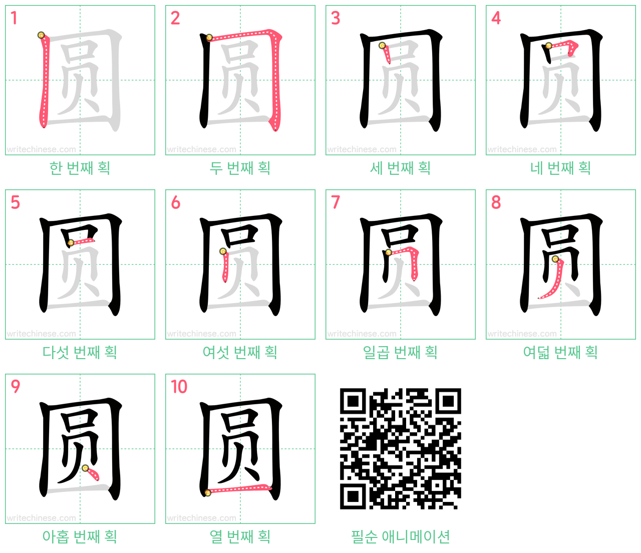 한 획 한 획: 圆의 쓰기 순서. 시각적인 단계별 안내를 통해 중국 문자 '圆'의 획을 하나씩 익혀 보세요.