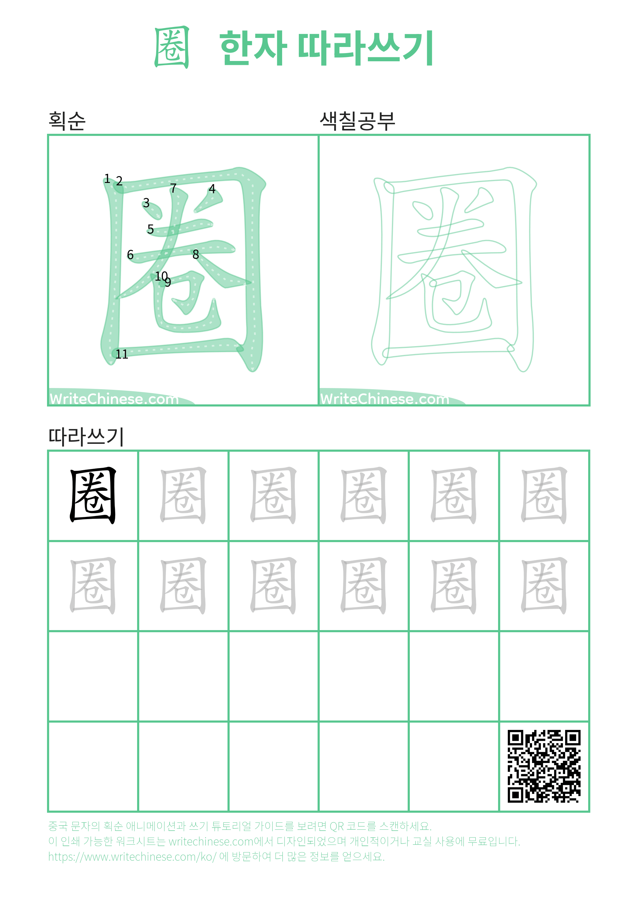 "圈"의 획순 애니메이션을 보면서 중국 문자 "圈"을 쓰는 법을 배워 보세요.