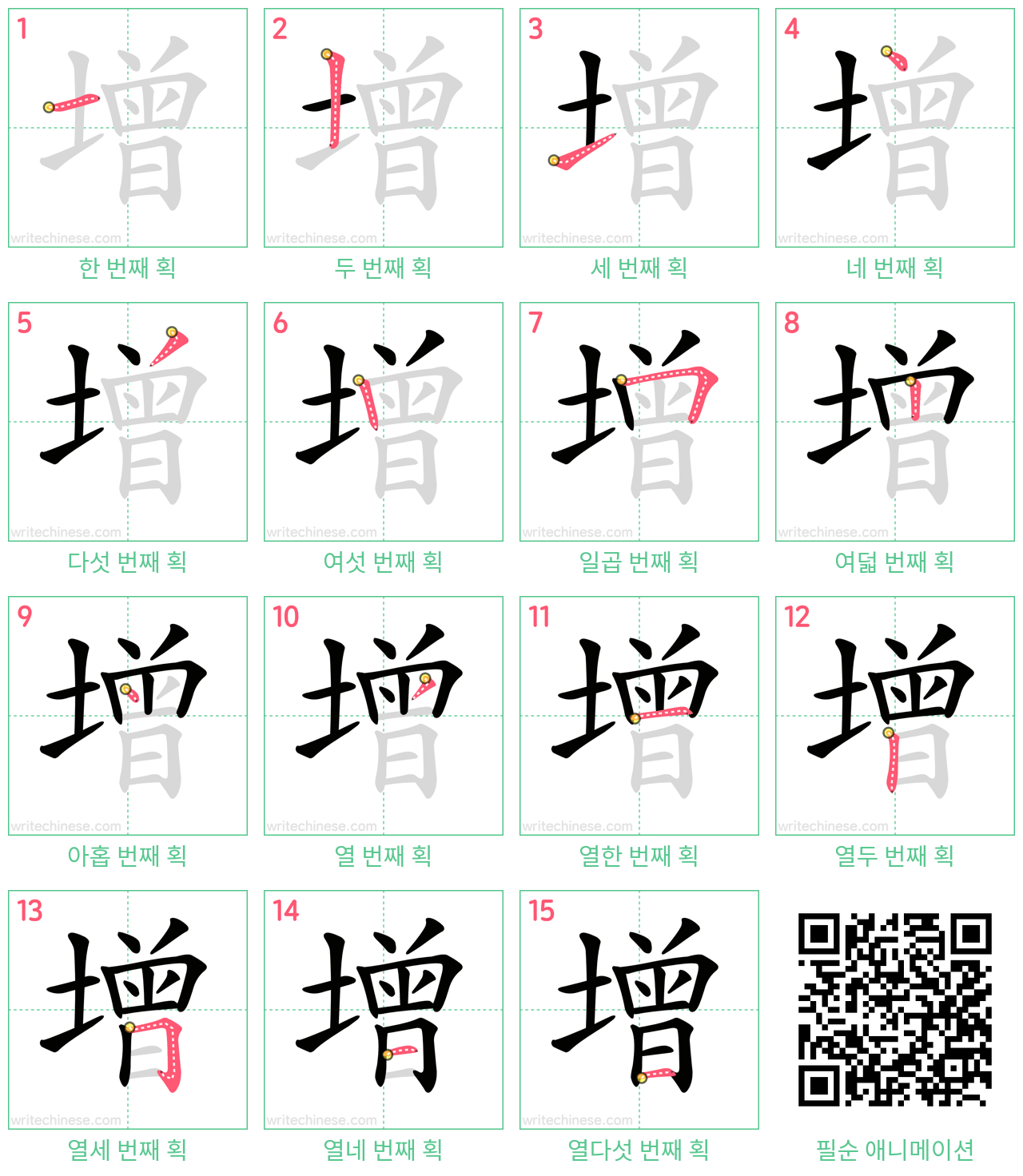 한 획 한 획: 增의 쓰기 순서. 시각적인 단계별 안내를 통해 중국 문자 '增'의 획을 하나씩 익혀 보세요.