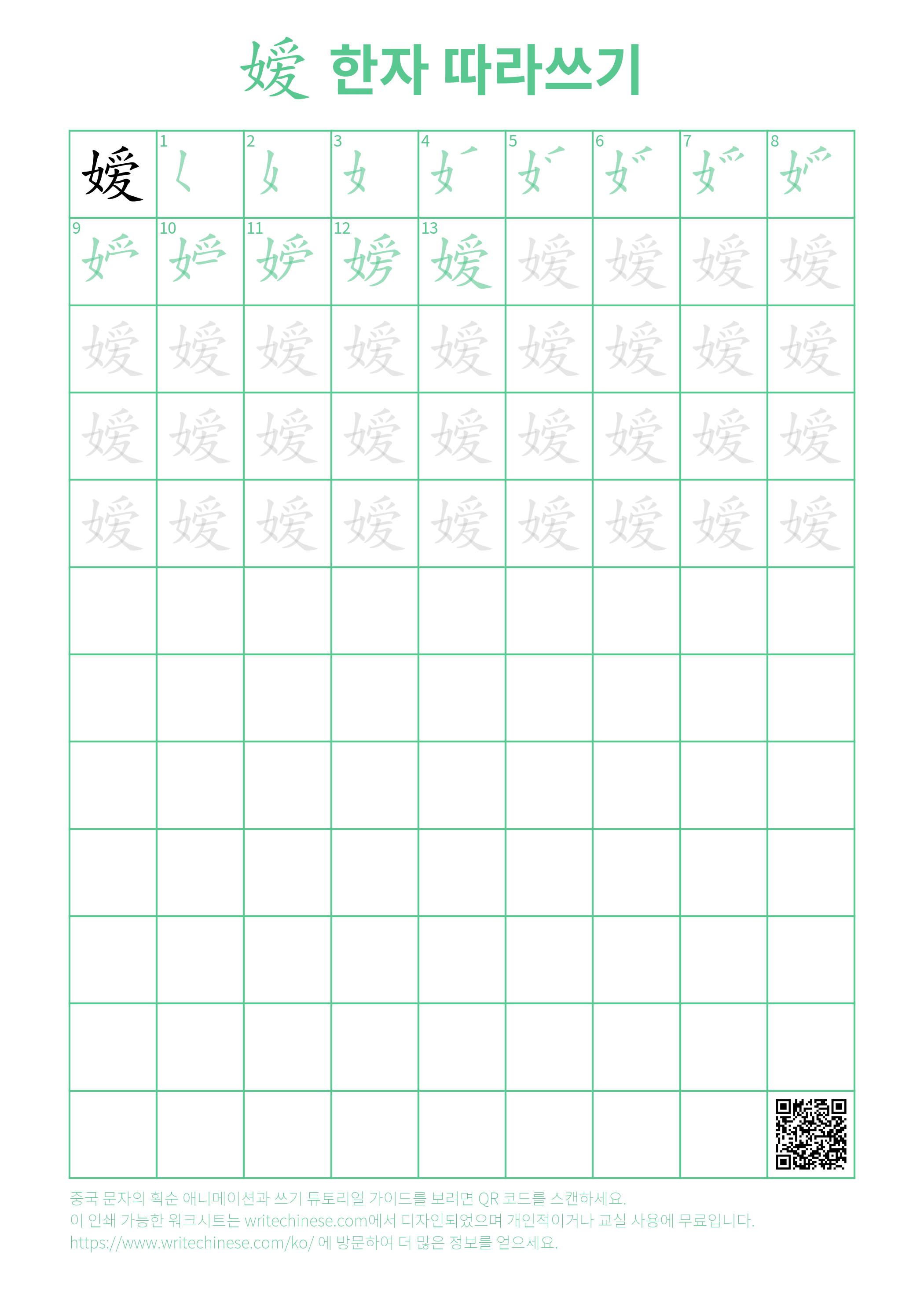 嫒의 획순 연습용 인쇄 가능한 연습지입니다