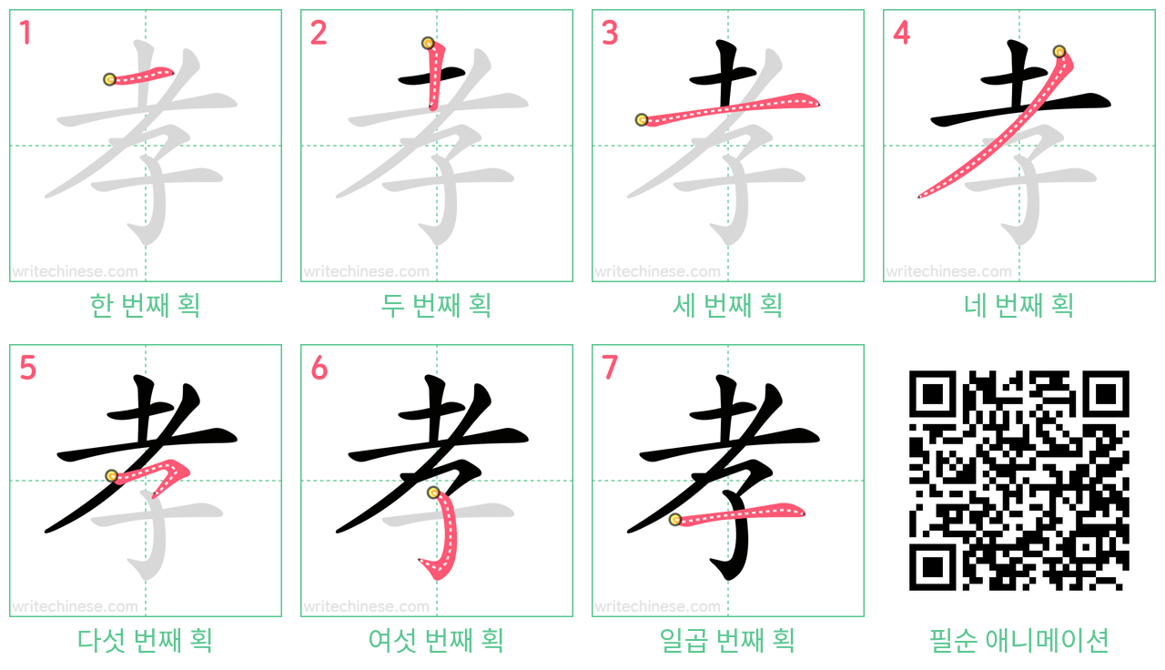 한 획 한 획: 孝의 쓰기 순서. 시각적인 단계별 안내를 통해 중국 문자 '孝'의 획을 하나씩 익혀 보세요.