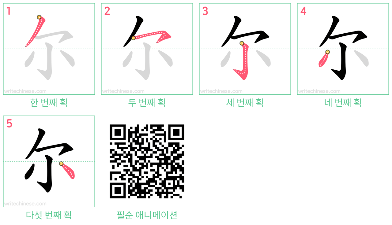 "尔"의 획순 애니메이션을 보면서 중국 문자 "尔"을 쓰는 법을 배워 보세요.