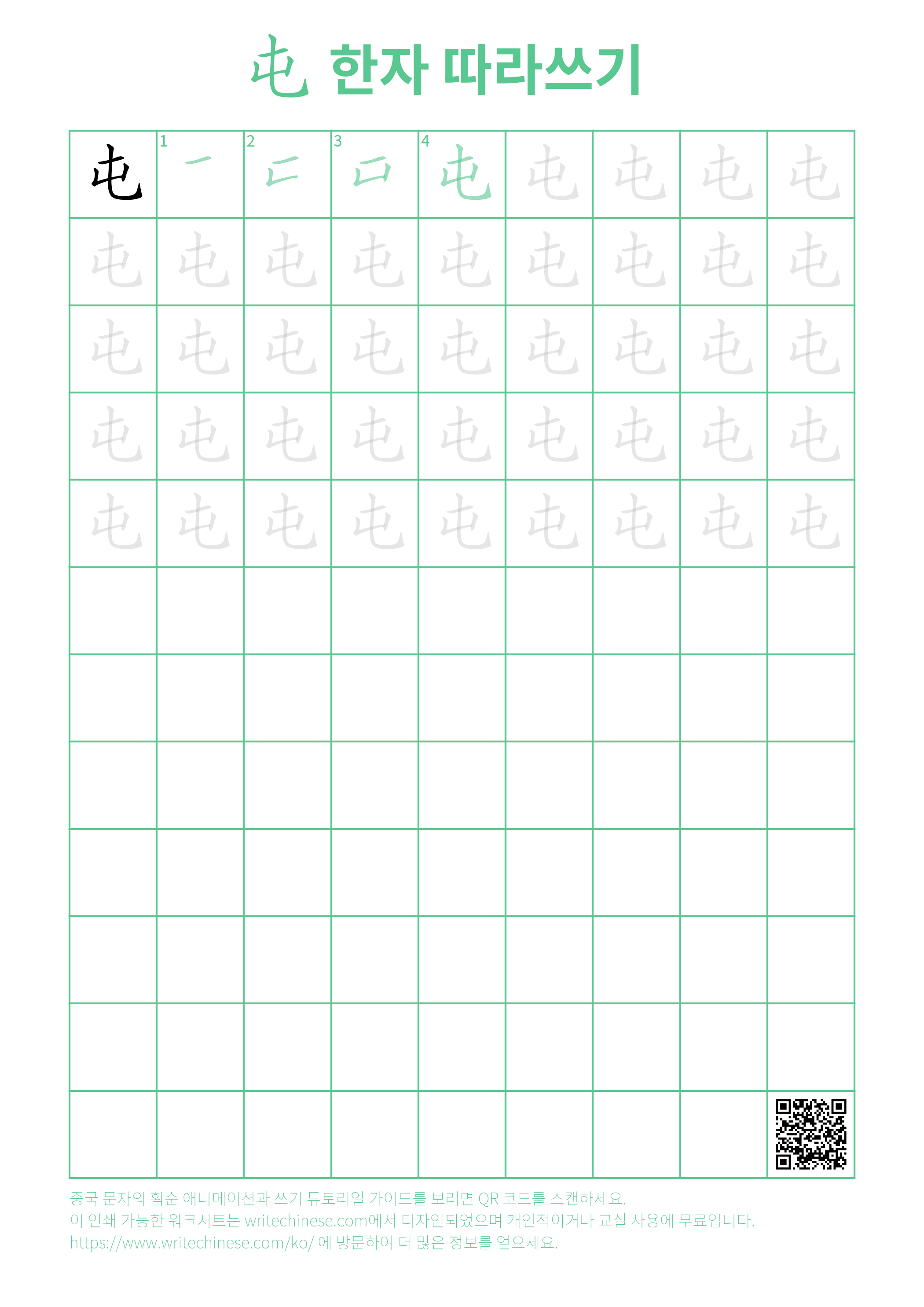 한 획 한 획: 屯의 쓰기 순서. 시각적인 단계별 안내를 통해 중국 문자 '屯'의 획을 하나씩 익혀 보세요.