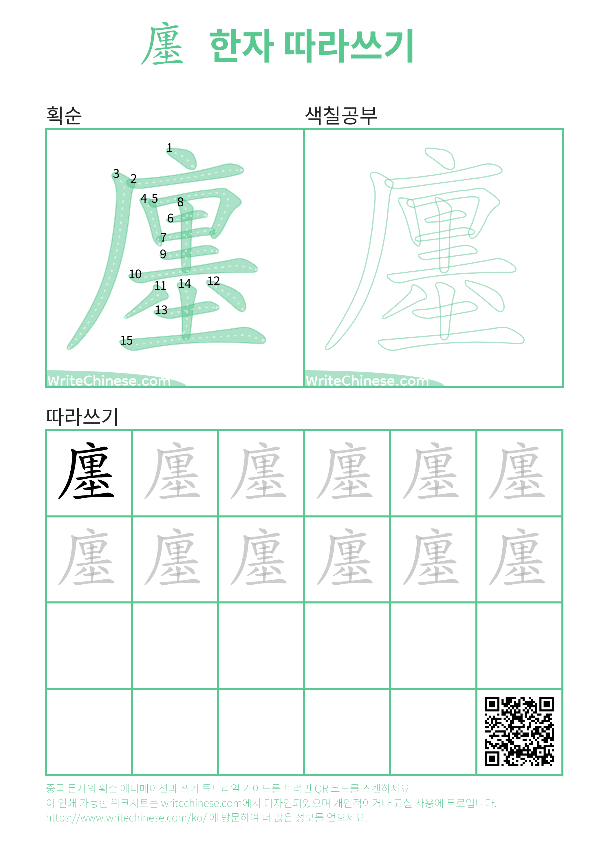 이 웹사이트의 중국어 획순 이미지, 애니메이션, 비디오 및 인쇄 가능한 연습지는 개인 또는 교실에서 무료로 사용할 수 있습니다. 사용할 때 출처와 웹사이트의 URL을 표기해 주세요.