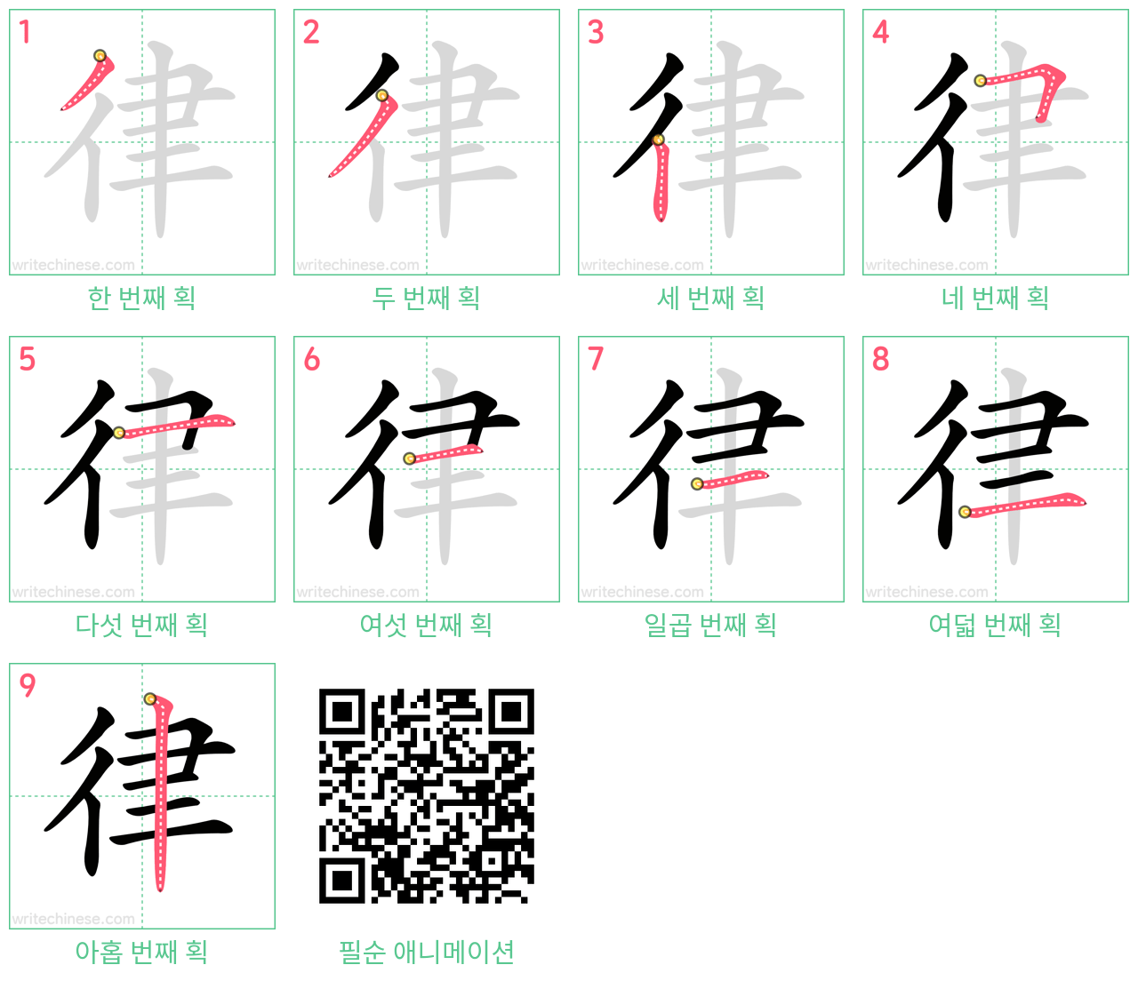 "律"의 획순 애니메이션을 보면서 중국 문자 "律"을 쓰는 법을 배워 보세요.