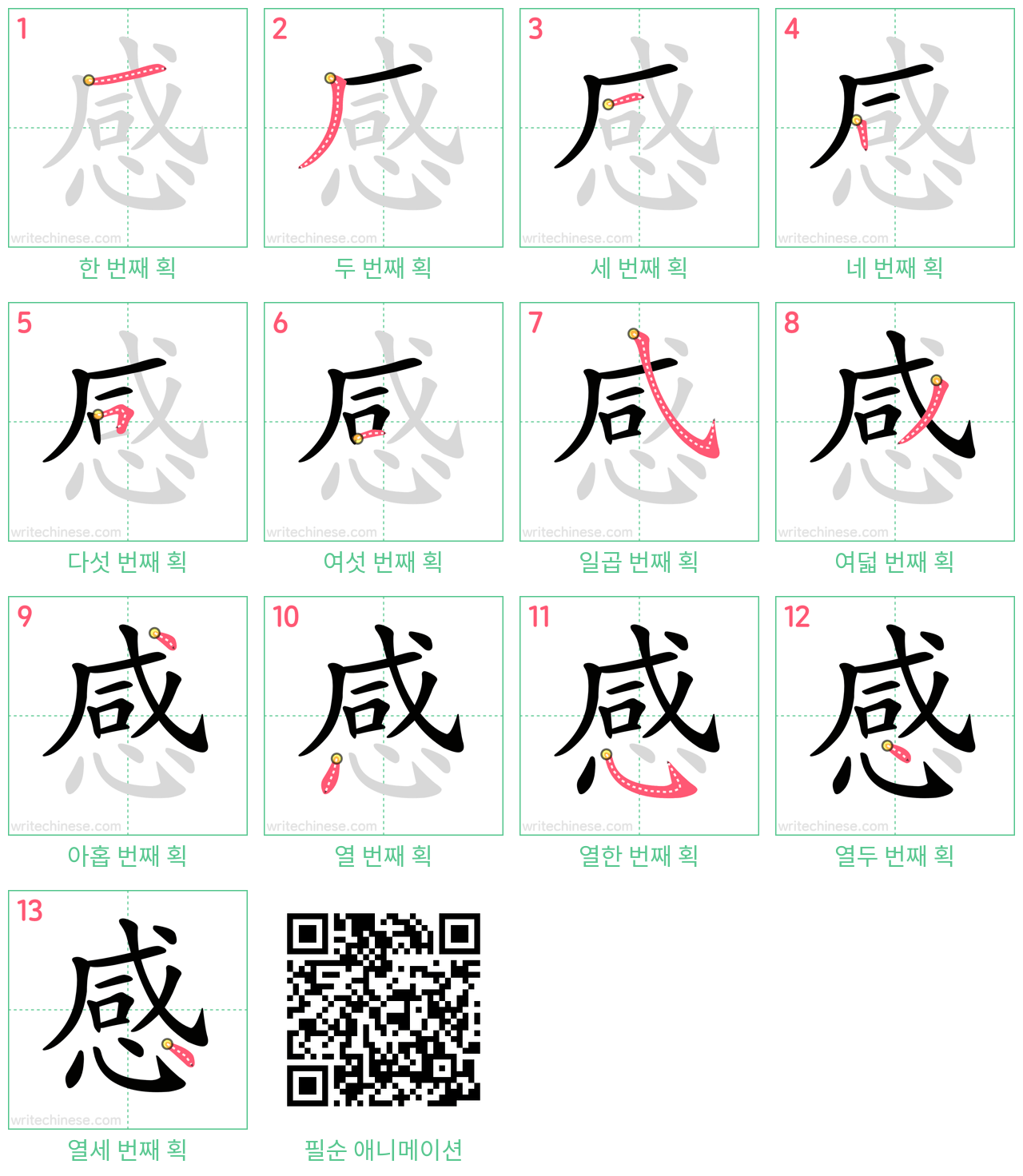 한 획 한 획: 感의 쓰기 순서. 시각적인 단계별 안내를 통해 중국 문자 '感'의 획을 하나씩 익혀 보세요.