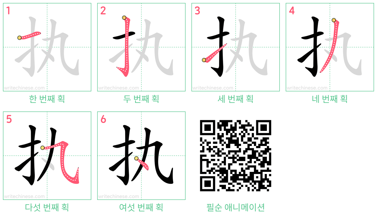执 执 zhí 1.拿着. ⦁ 가지고 있다. 2.掌握. ⦁ 통제하다. 3.捕捉,逮捕. ⦁ 잡다, 체포하다. 4.坚持. ⦁ 고집하다. 5.实行. ⦁ 실행하다. 6.凭单. ⦁ 영수증. 7.朋友. ⦁ 친구. 8.姓. ⦁ 성.