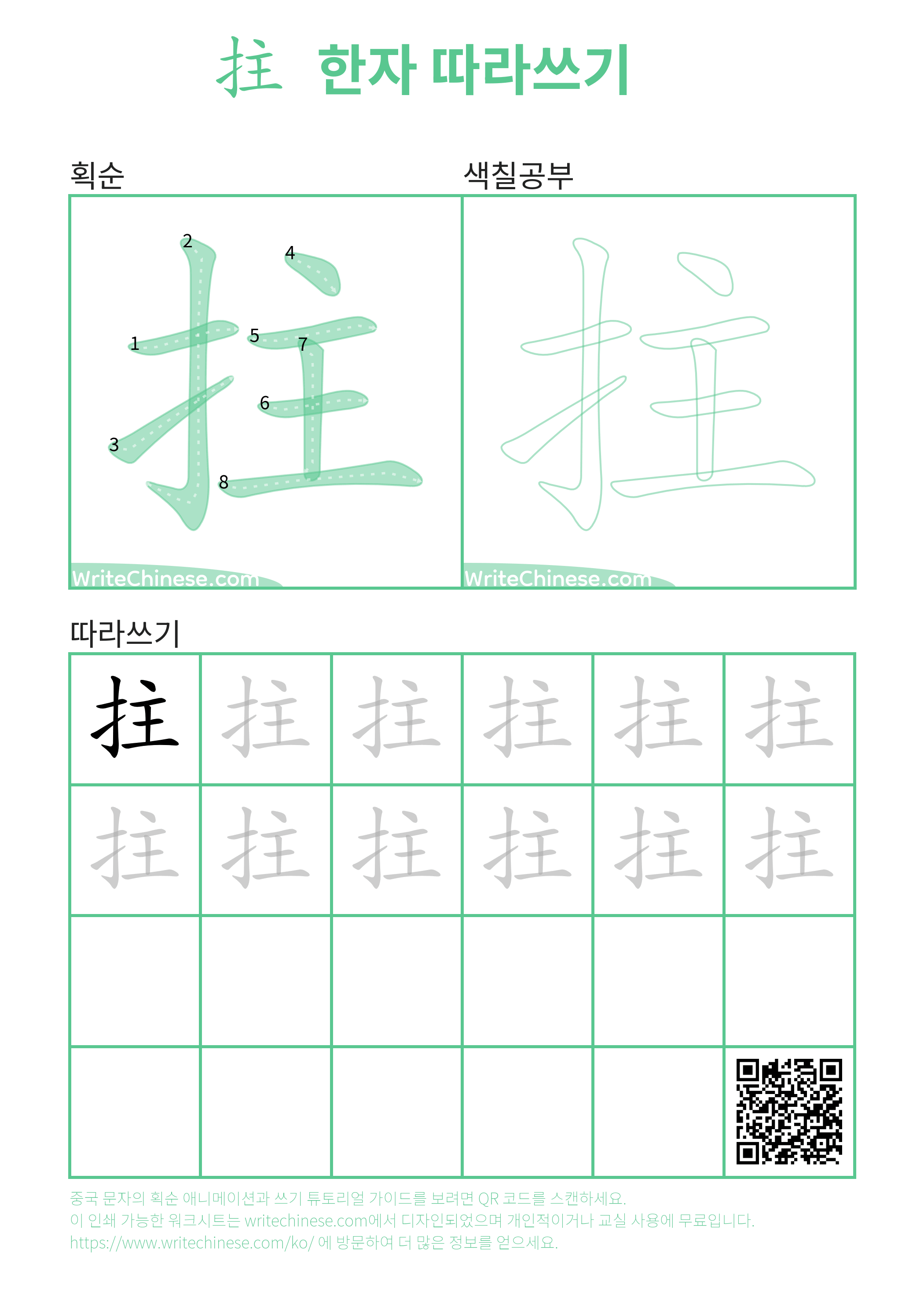 한 획 한 획: 拄의 쓰기 순서. 시각적인 단계별 안내를 통해 중국 문자 '拄'의 획을 하나씩 익혀 보세요.