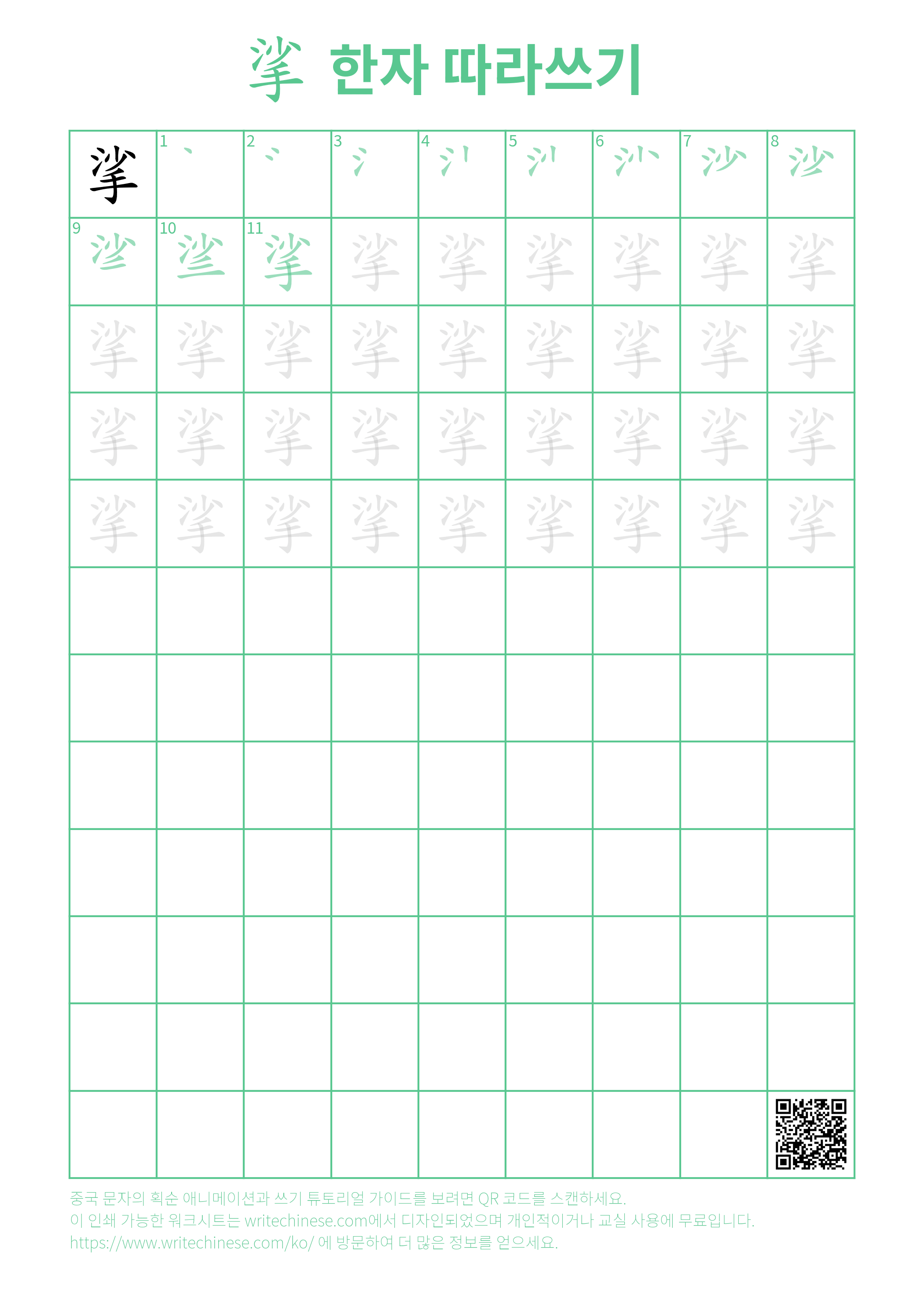 挲의 획순 연습용 인쇄 가능한 연습지입니다
