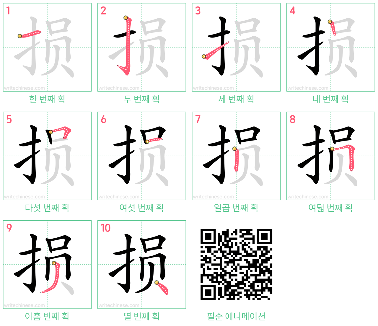 损의 획순 연습용 인쇄 가능한 연습지입니다
