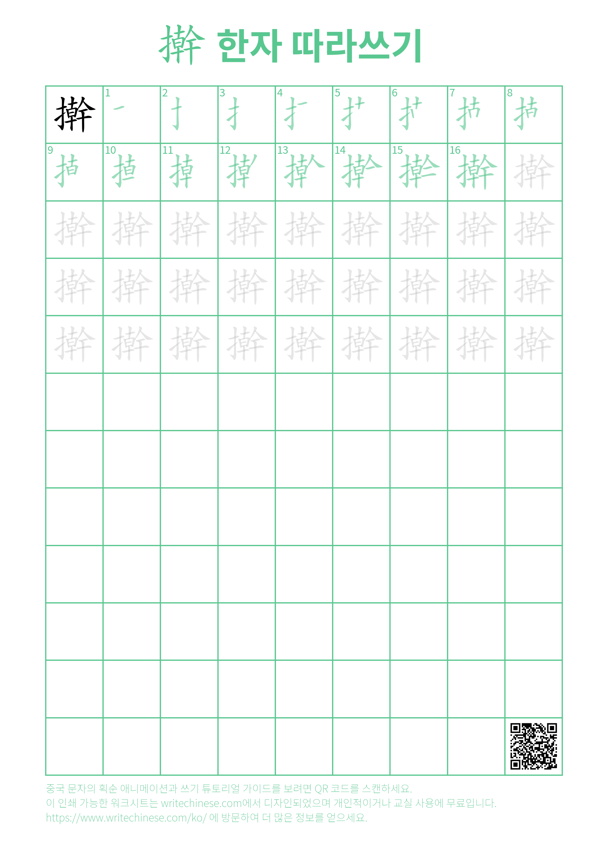 이 웹사이트의 중국어 획순 이미지, 애니메이션, 비디오 및 인쇄 가능한 연습지는 개인 또는 교실에서 무료로 사용할 수 있습니다. 사용할 때 출처와 웹사이트의 URL을 표기해 주세요.