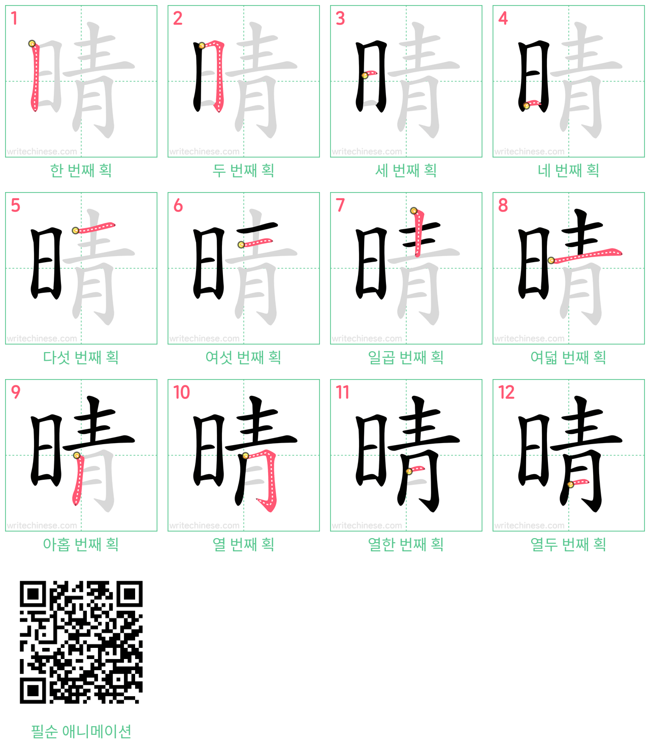 한 획 한 획: 晴의 쓰기 순서. 시각적인 단계별 안내를 통해 중국 문자 '晴'의 획을 하나씩 익혀 보세요.