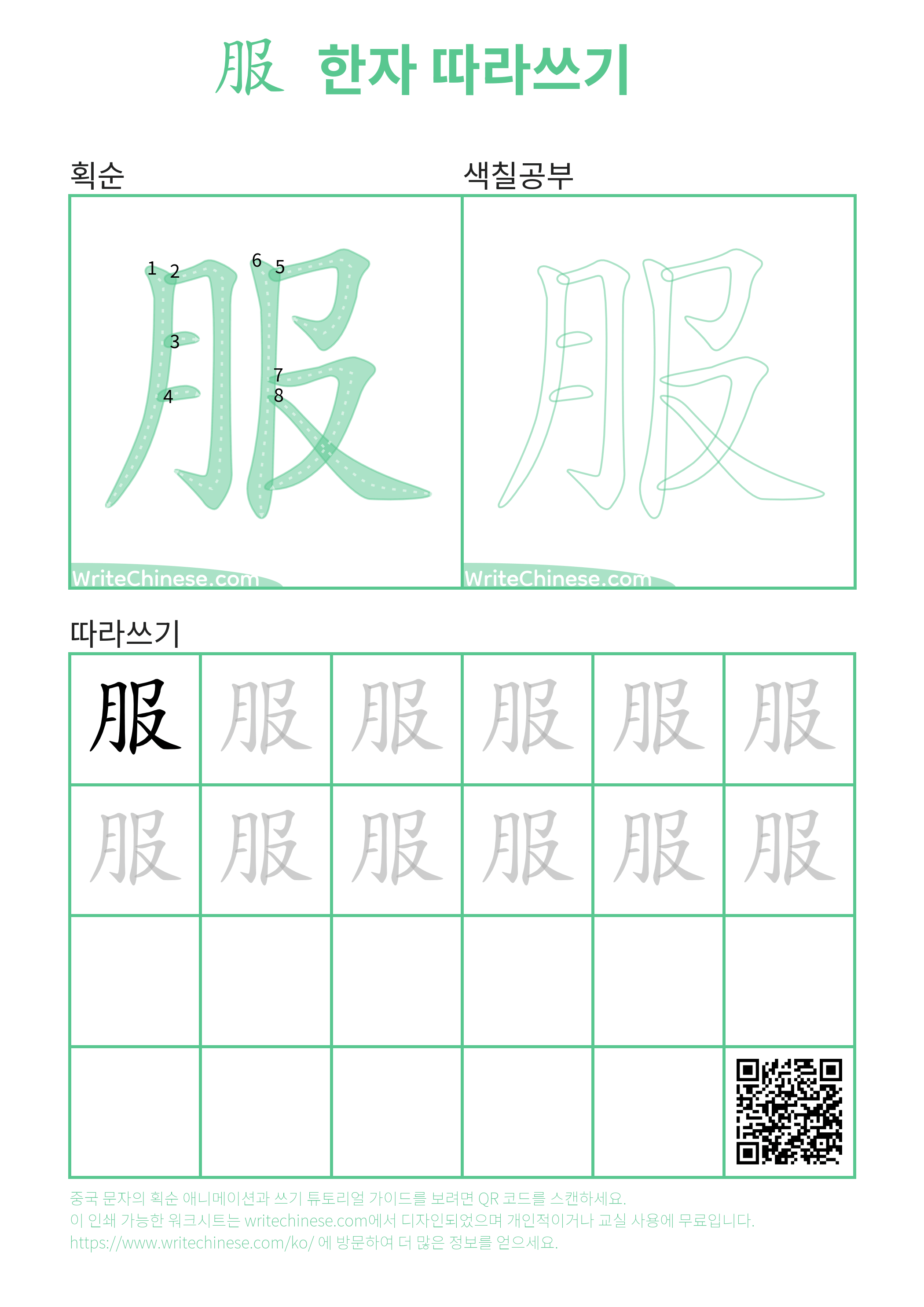 服의 획순 연습용 인쇄 가능한 연습지입니다