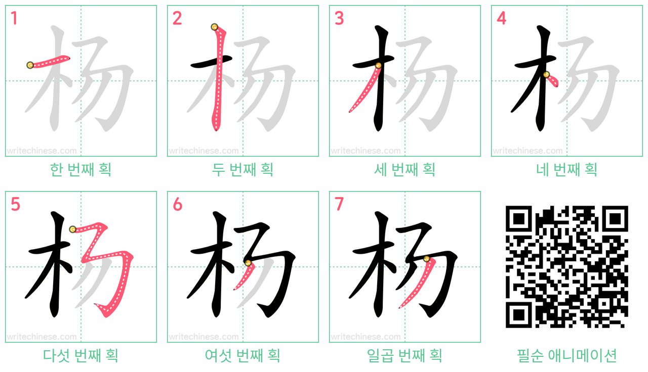 한 획 한 획: 杨의 쓰기 순서. 시각적인 단계별 안내를 통해 중국 문자 '杨'의 획을 하나씩 익혀 보세요.