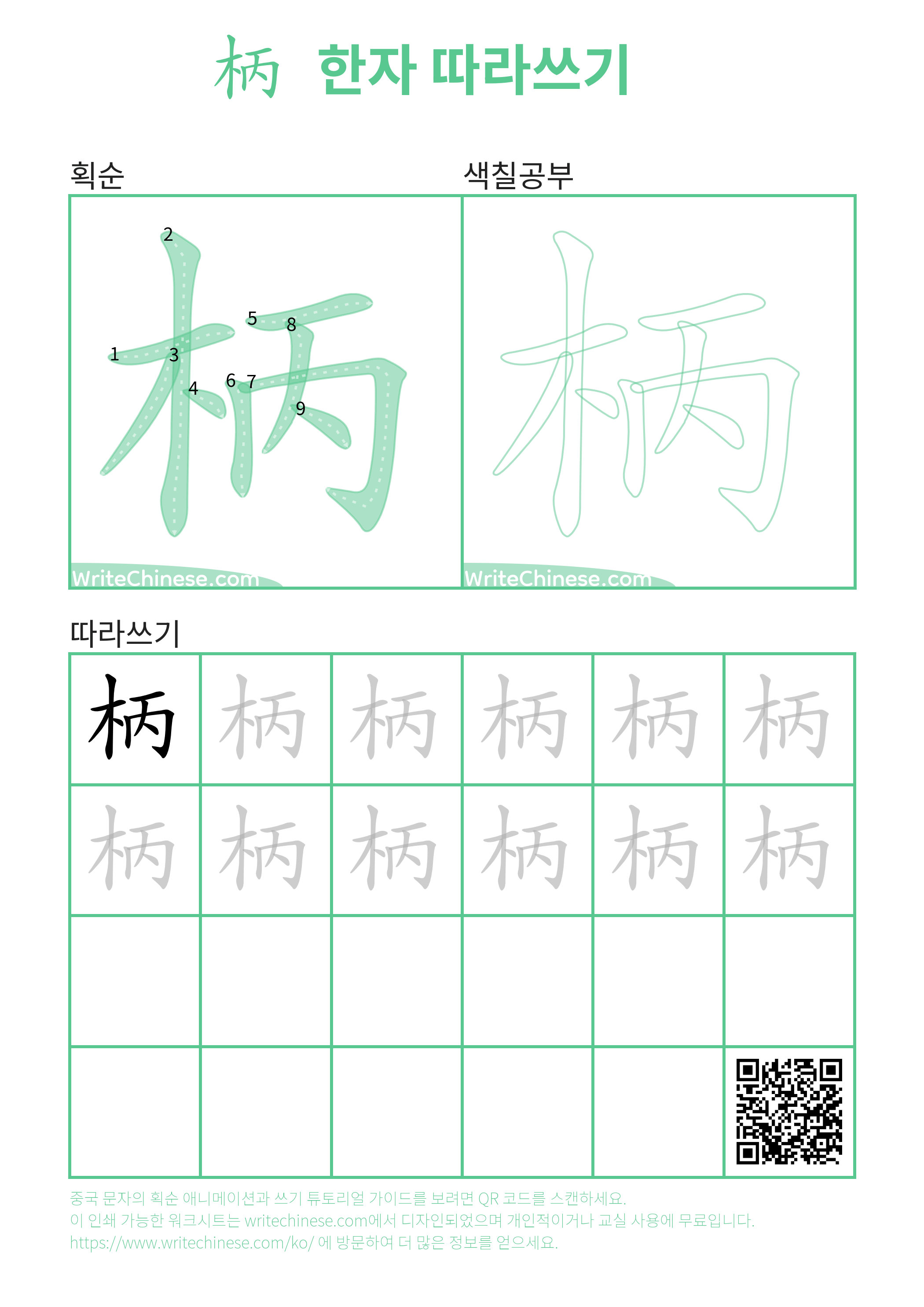 "柄"의 획순 애니메이션을 보면서 중국 문자 "柄"을 쓰는 법을 배워 보세요.