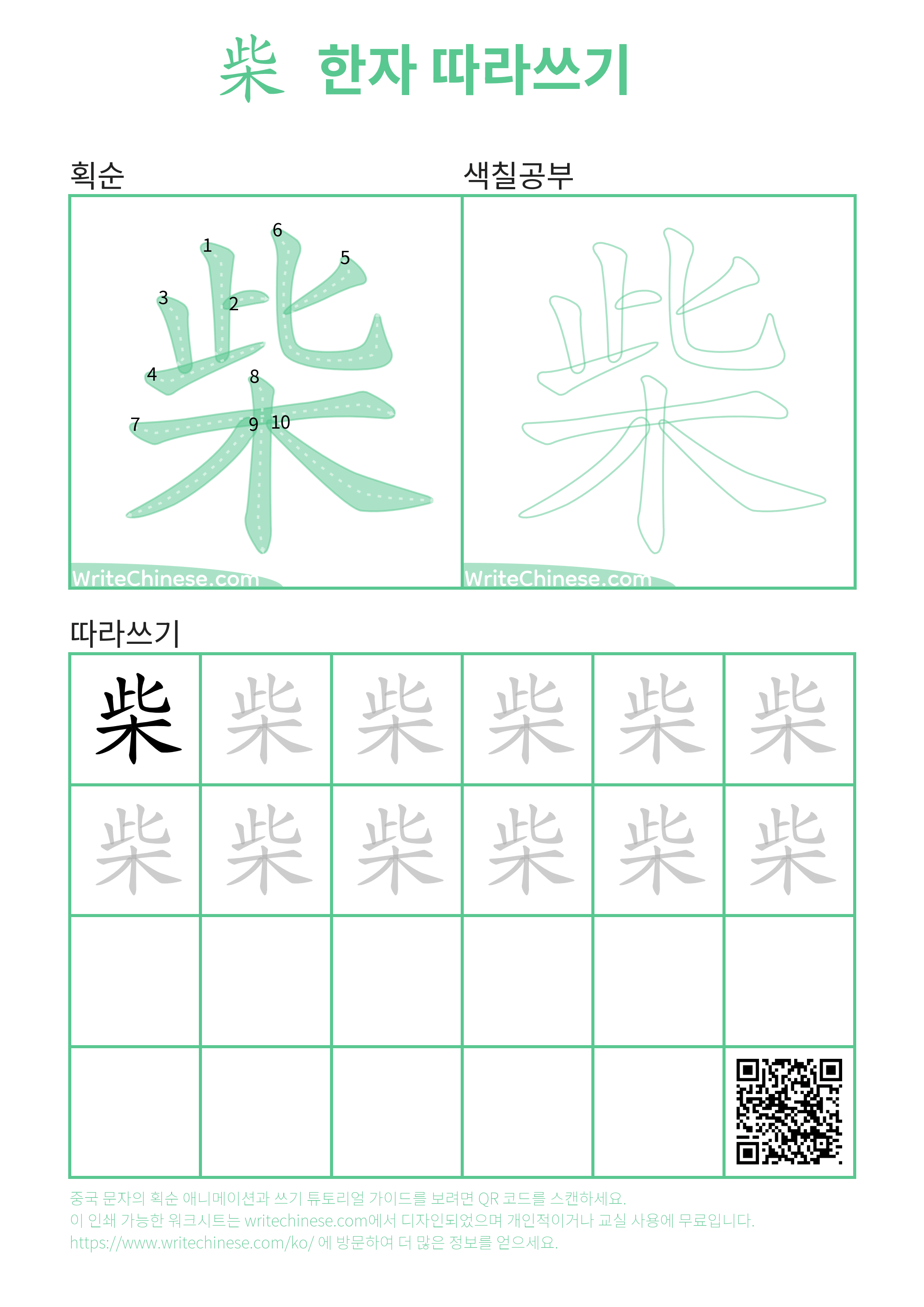 글씨 대가를 따라가며 '柴' 문자를 단계별로 쓰는 방법을 익혀 보세요. 캘리그라피 선생님과 함께하는 비디오 튜토리얼을 통해 중국 문자 '柴'의 올바른 쓰기 방법을 배울 수 있습니다. 아래 링크에서 인쇄용 필기 연습지를 다운로드하여 종이와 펜과 함께 연습해 보세요.