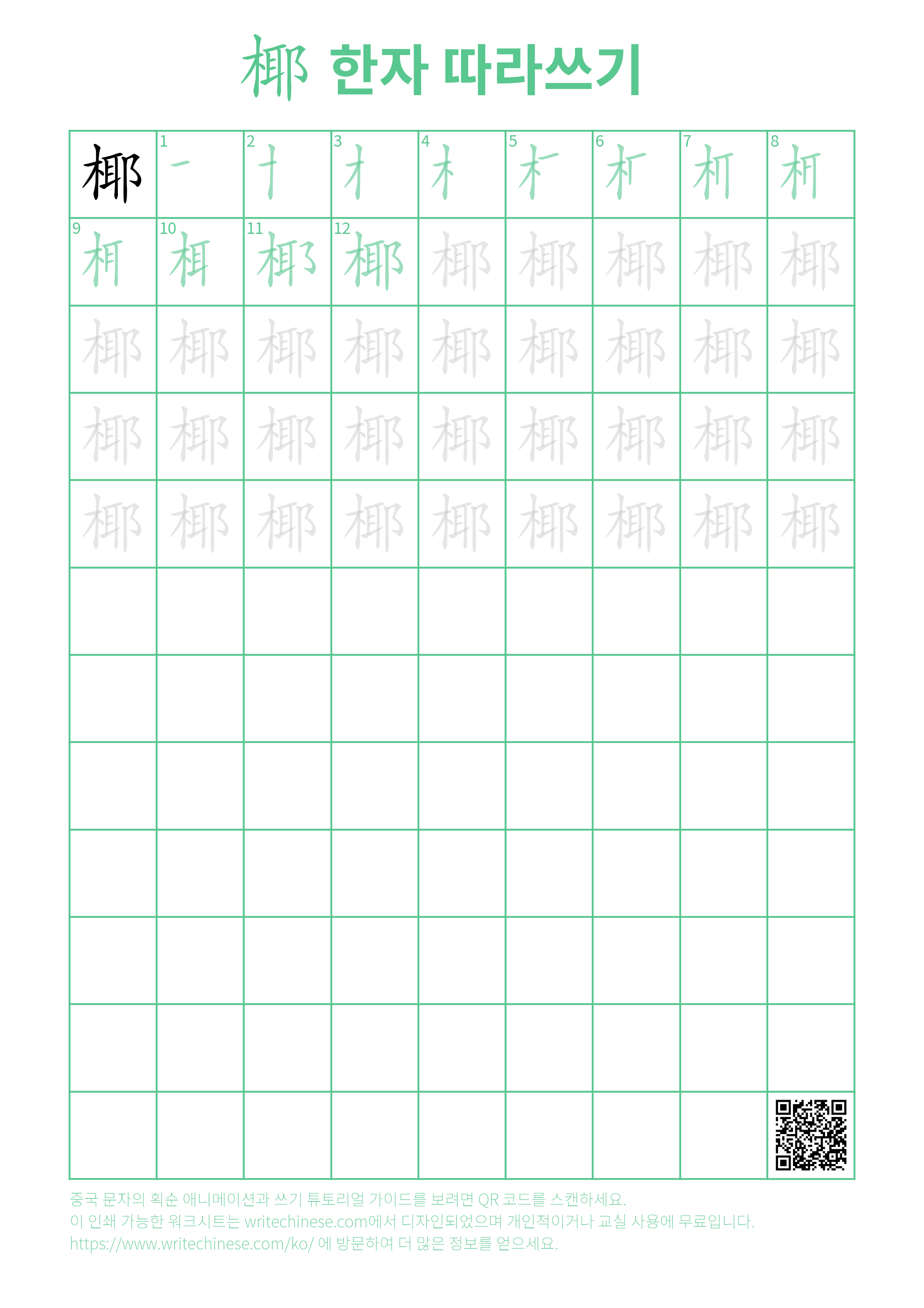 글씨 대가를 따라가며 '椰' 문자를 단계별로 쓰는 방법을 익혀 보세요. 캘리그라피 선생님과 함께하는 비디오 튜토리얼을 통해 중국 문자 '椰'의 올바른 쓰기 방법을 배울 수 있습니다. 아래 링크에서 인쇄용 필기 연습지를 다운로드하여 종이와 펜과 함께 연습해 보세요.