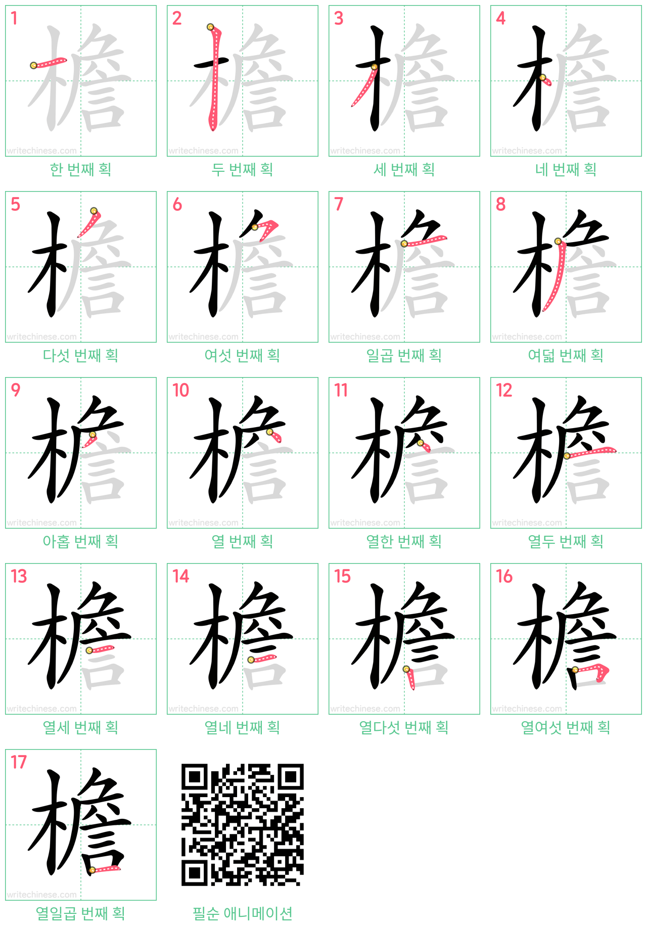 "檐"의 획순 애니메이션을 보면서 중국 문자 "檐"을 쓰는 법을 배워 보세요.